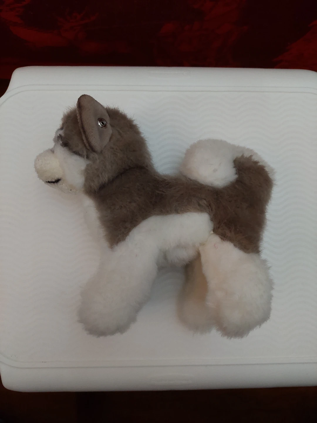 This is a cute plush toy husky dog. It's soft and fluffy, with brown and white fur. It's a great size for cuddling or displaying. Kids will love playing with this adorable stuffed animal!