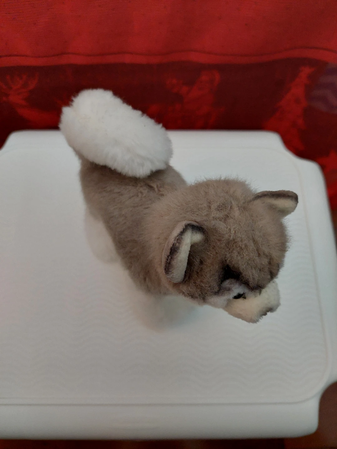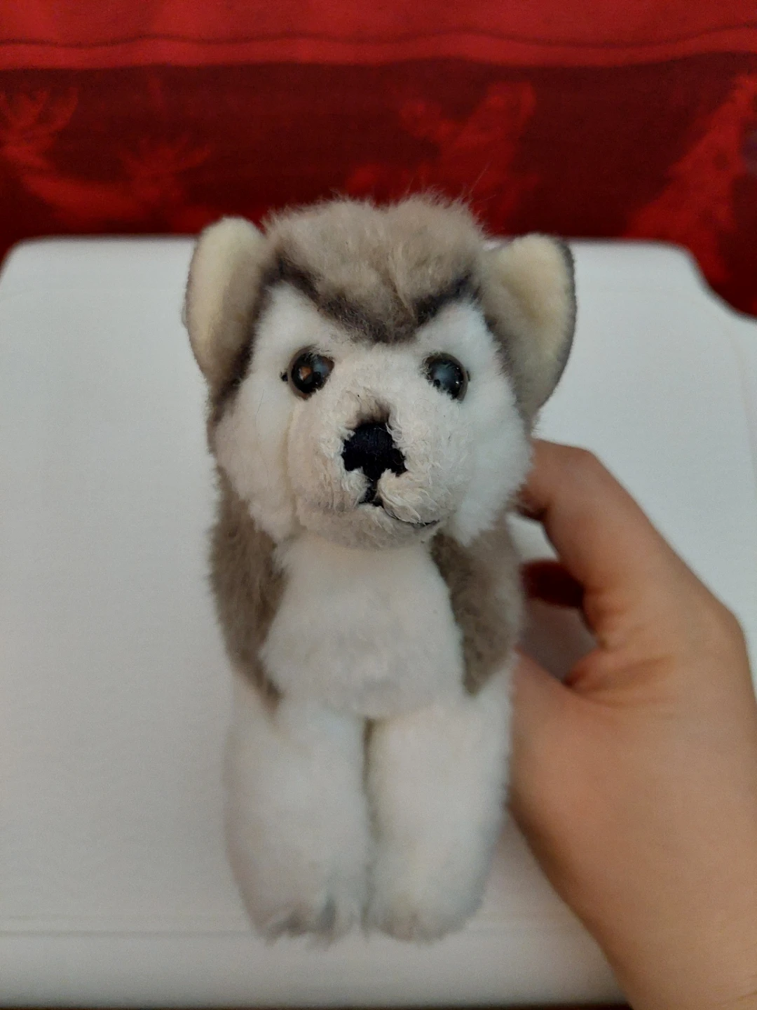 This is a cute plush toy husky dog. It's soft and fluffy, with brown and white fur. It's a great size for cuddling or displaying. Kids will love playing with this adorable stuffed animal!