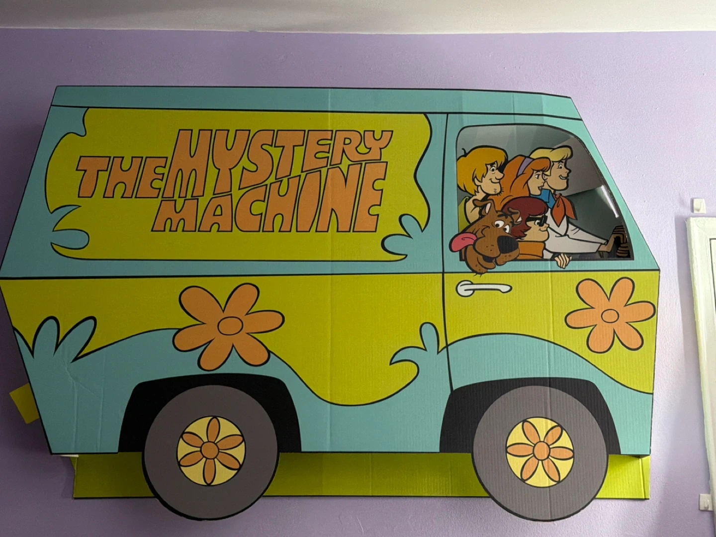 This cardboard cutout features the iconic Mystery Machine from Scooby-Doo with the gang inside. It's a fun decoration for parties or a fan's room. Made of corrugated cardboard.