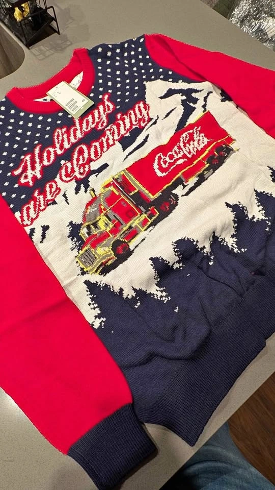 Festive H&M Coca-Cola holiday sweater with the iconic red Coca-Cola truck design and 'Holidays are Coming' text. Red, white, and blue colors. Size US XL. Perfect for holiday vibes. Pickup in the SW in Alpine Park or downtown near Chinatown on select weekdays.
