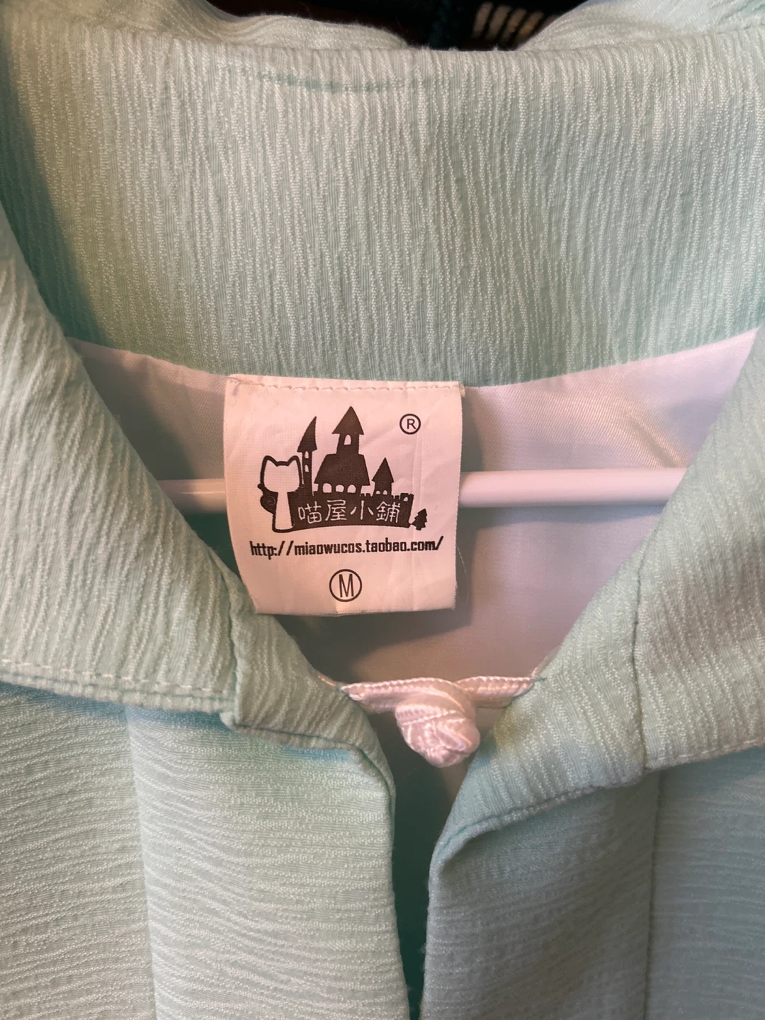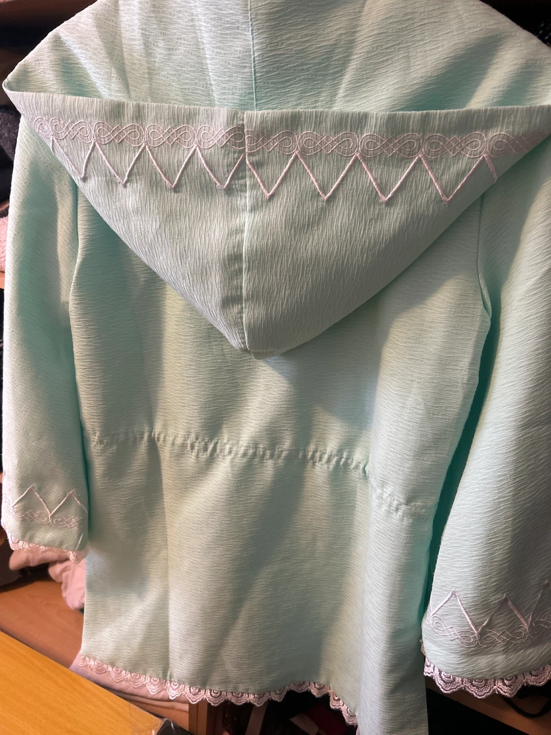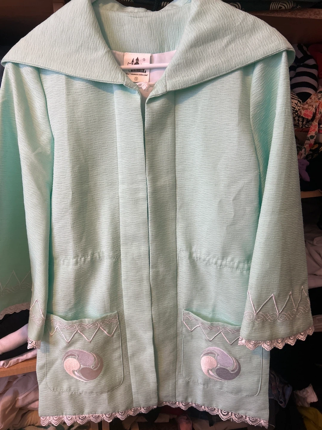 Light mint green jacket with embroidered details on the pockets and cuffs. It's a size medium. The fabric has a textured finish and it closes with a tie at the front. This jacket would be nice for a spring or summer outing!