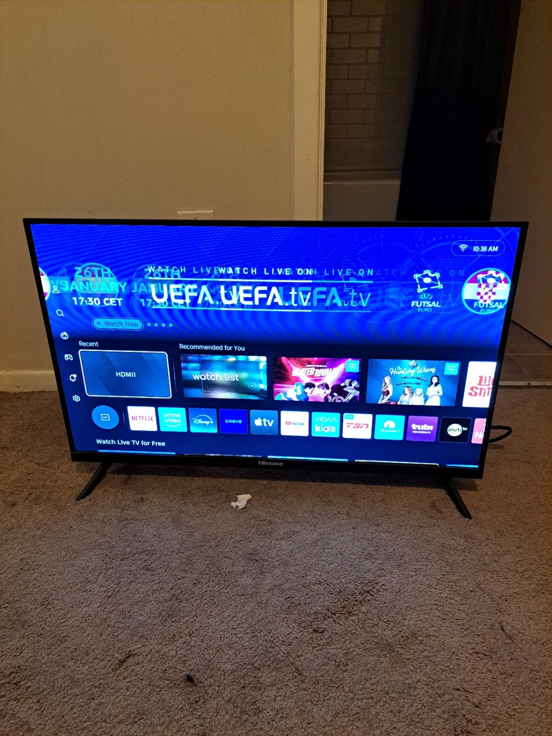 It's a Hisense 32-inch smart TV. It has multiple HDMI and USB ports. The TV comes with a remote. No issues at all