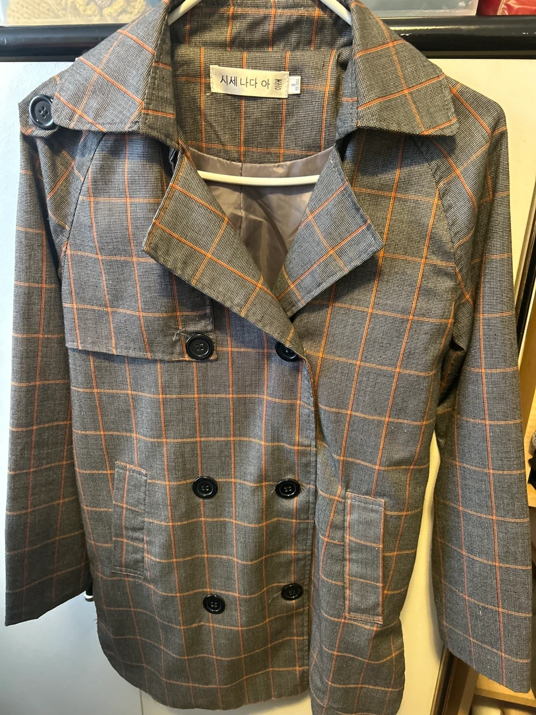 This blazer features a classic grey and orange plaid pattern. It has a double-breasted front with dark buttons. The inner lining is a smooth grey fabric. It's suitable for adding a stylish touch to any outfit.