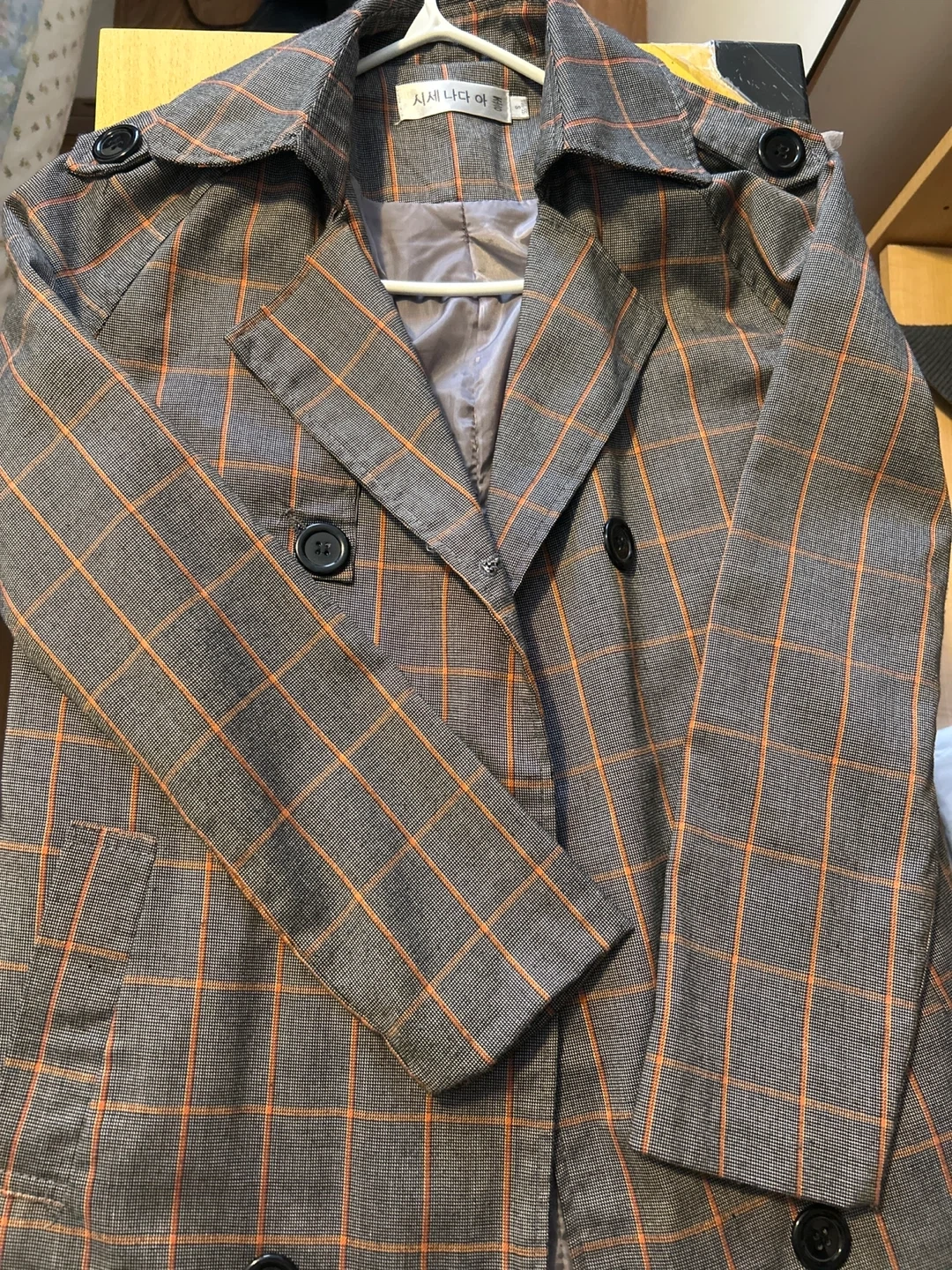 This blazer features a classic grey and orange plaid pattern. It has a double-breasted front with dark buttons. The inner lining is a smooth grey fabric. It's suitable for adding a stylish touch to any outfit.