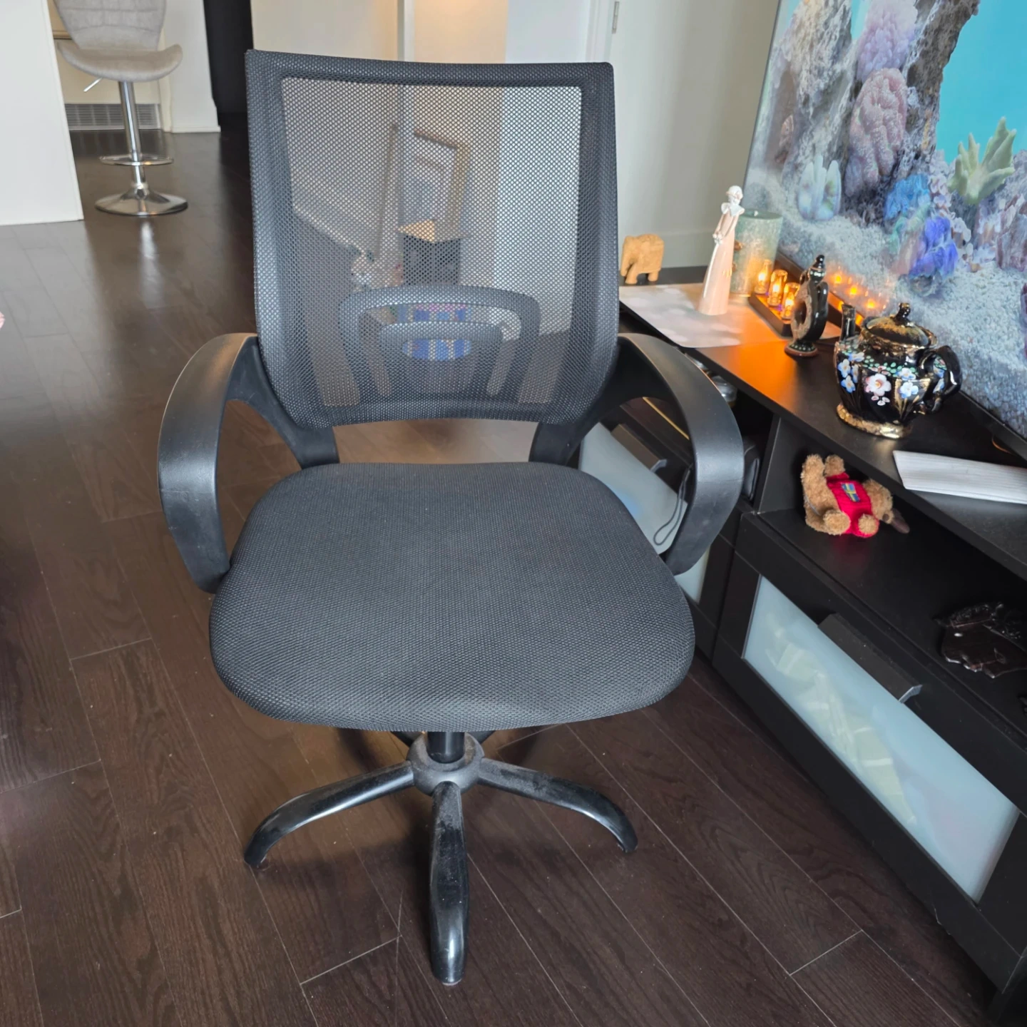 This is a black mesh office chair. It features a comfortable padded seat and a breathable mesh back. The chair is on wheels for easy mobility. I am currently using the chair without wheels to protect the floor. I will provide the wheels as well. Thank you