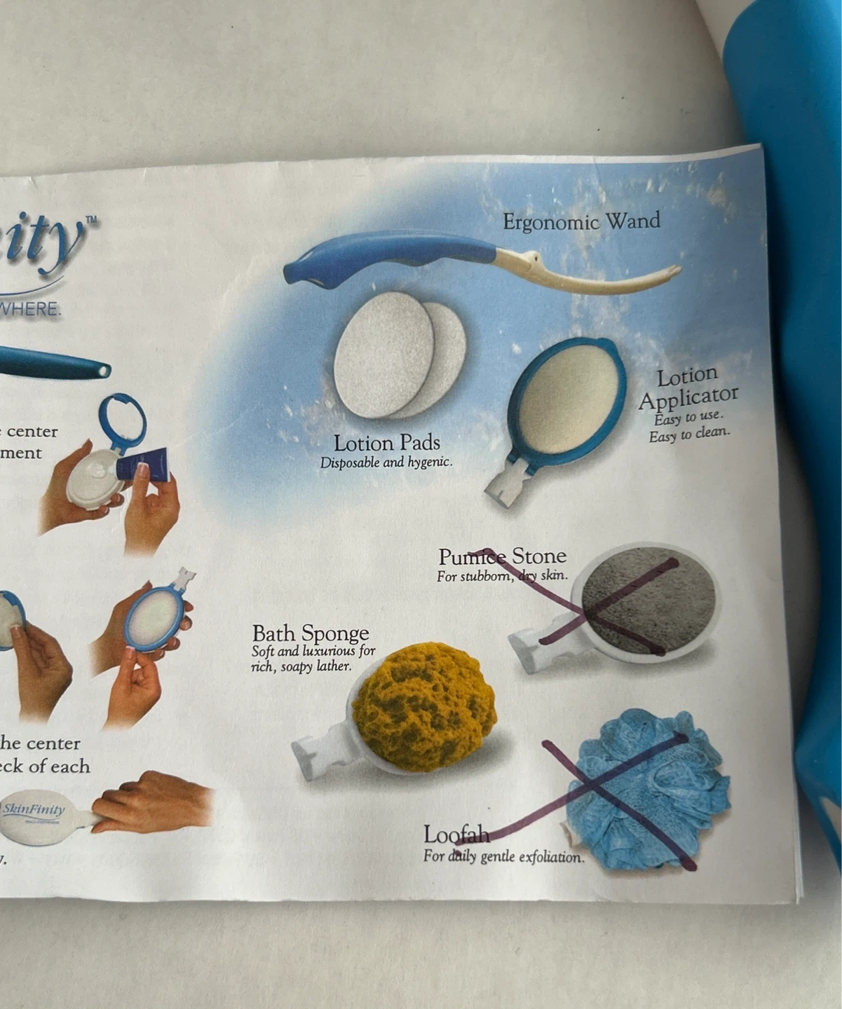 Brand new - SkinFinity kit helps you reach difficult areas for lotion application and skin care. It includes an ergonomic wand, lotion applicator, bath sponge and 10 reusable lotion pads. Apply lotions and care for your skin with ease! Never use!!