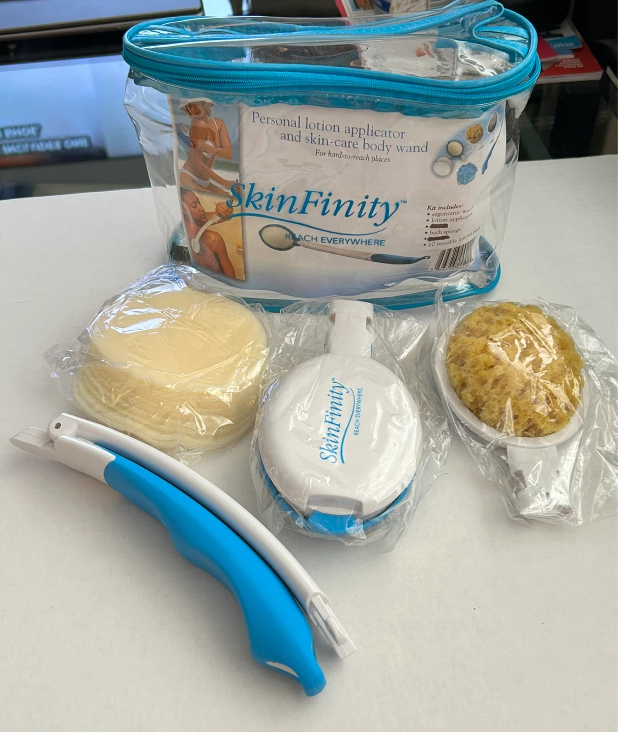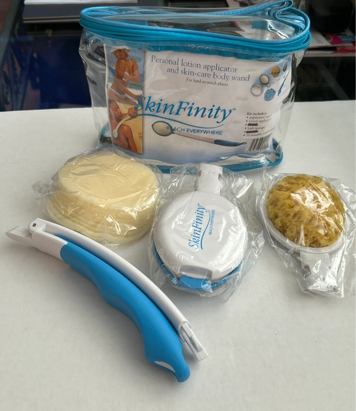 Brand new - SkinFinity kit helps you reach difficult areas for lotion application and skin care. It includes an ergonomic wand, lotion applicator, bath sponge and 10 reusable lotion pads. Apply lotions and care for your skin with ease! Never use!!