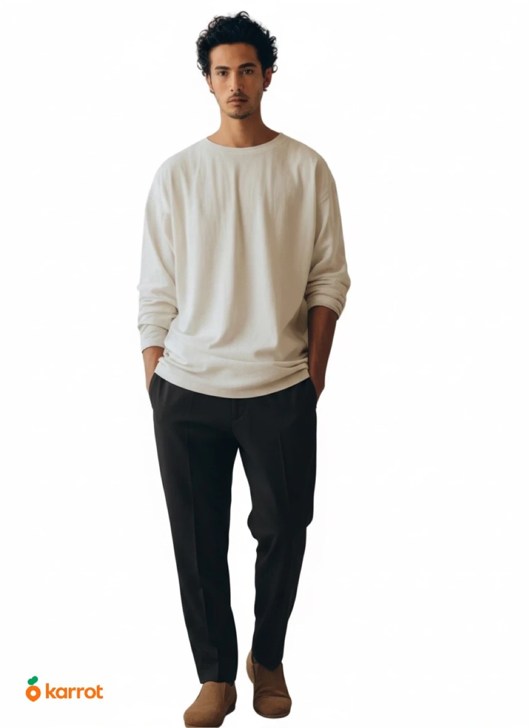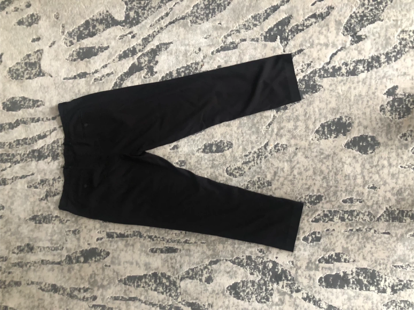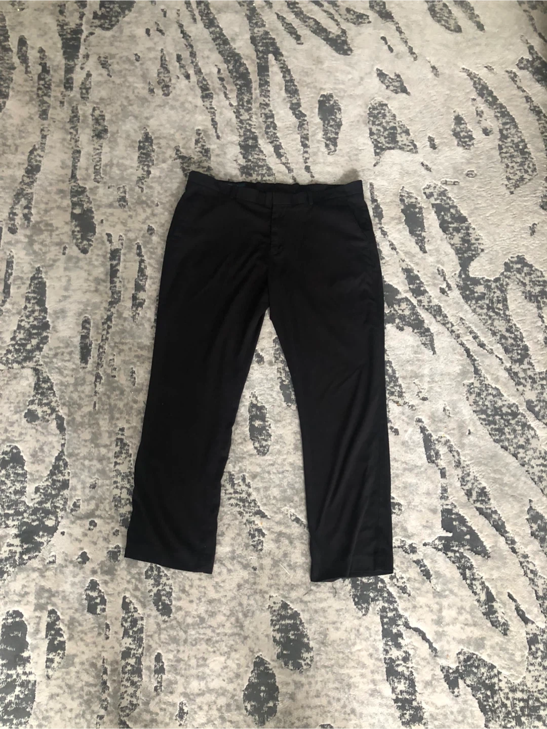 Black pants with an elastic waistband. They're made of a blend fabric. These pants are suitable for casual or semi-formal wear.