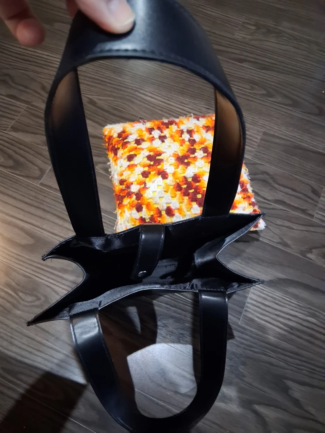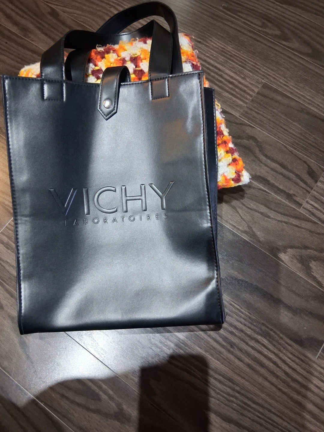 This is a black tote bag from Vichy Laboratoires. It's made of faux leather and has a snap closure. Perfect for carrying essentials!