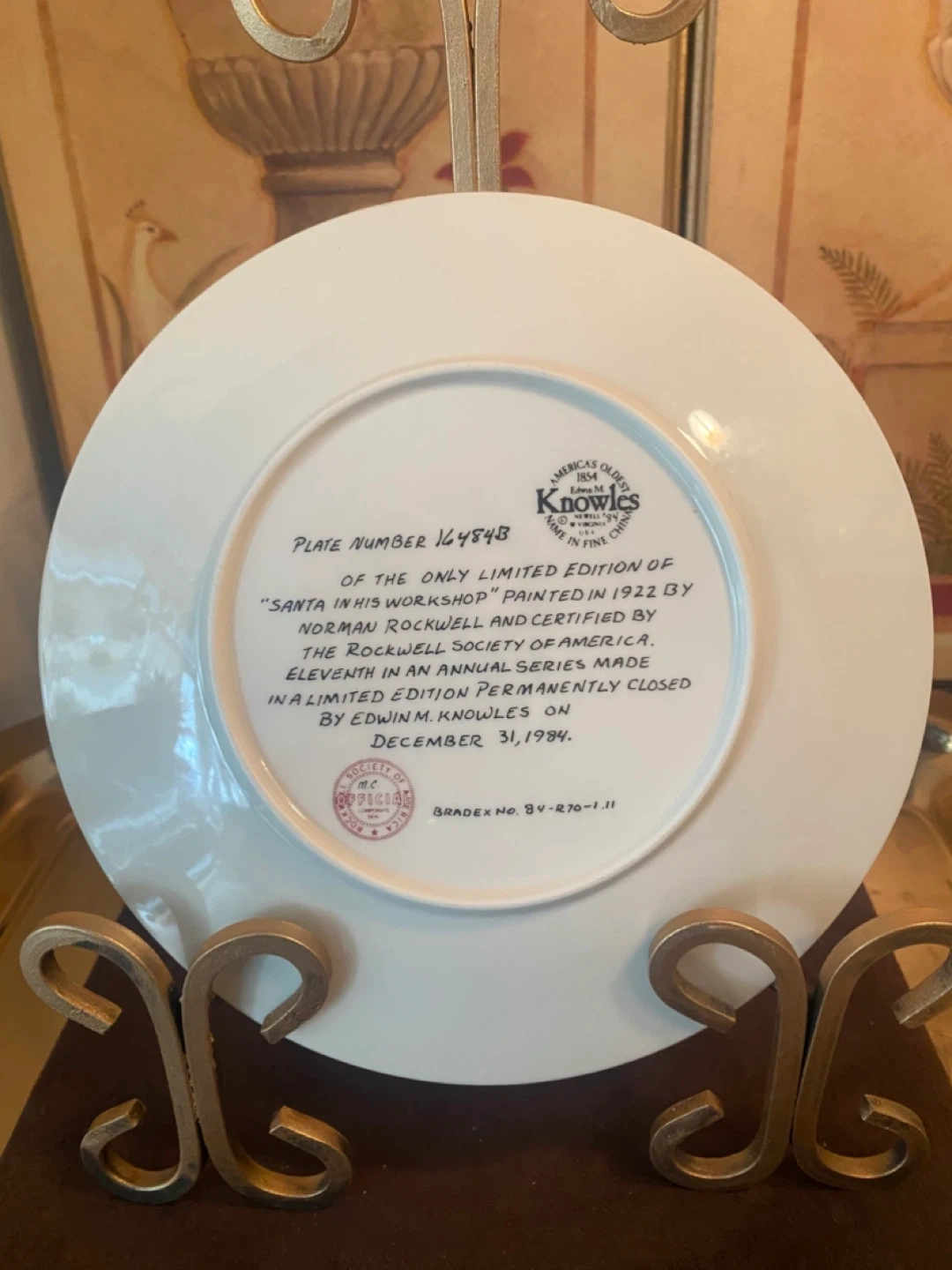 This is the Knowles "Santa in His Workshop" decorative plate from 1984. It's from the first limited edition, painted .This early 20th-century watercolor by Norman Rockwell. Certified by The Rockwell Society of America. Permanently closed in a limited edition series on December 31, 1984.