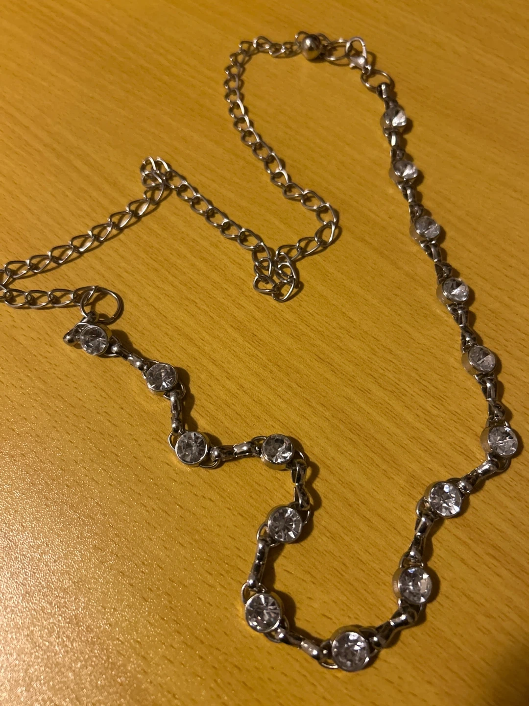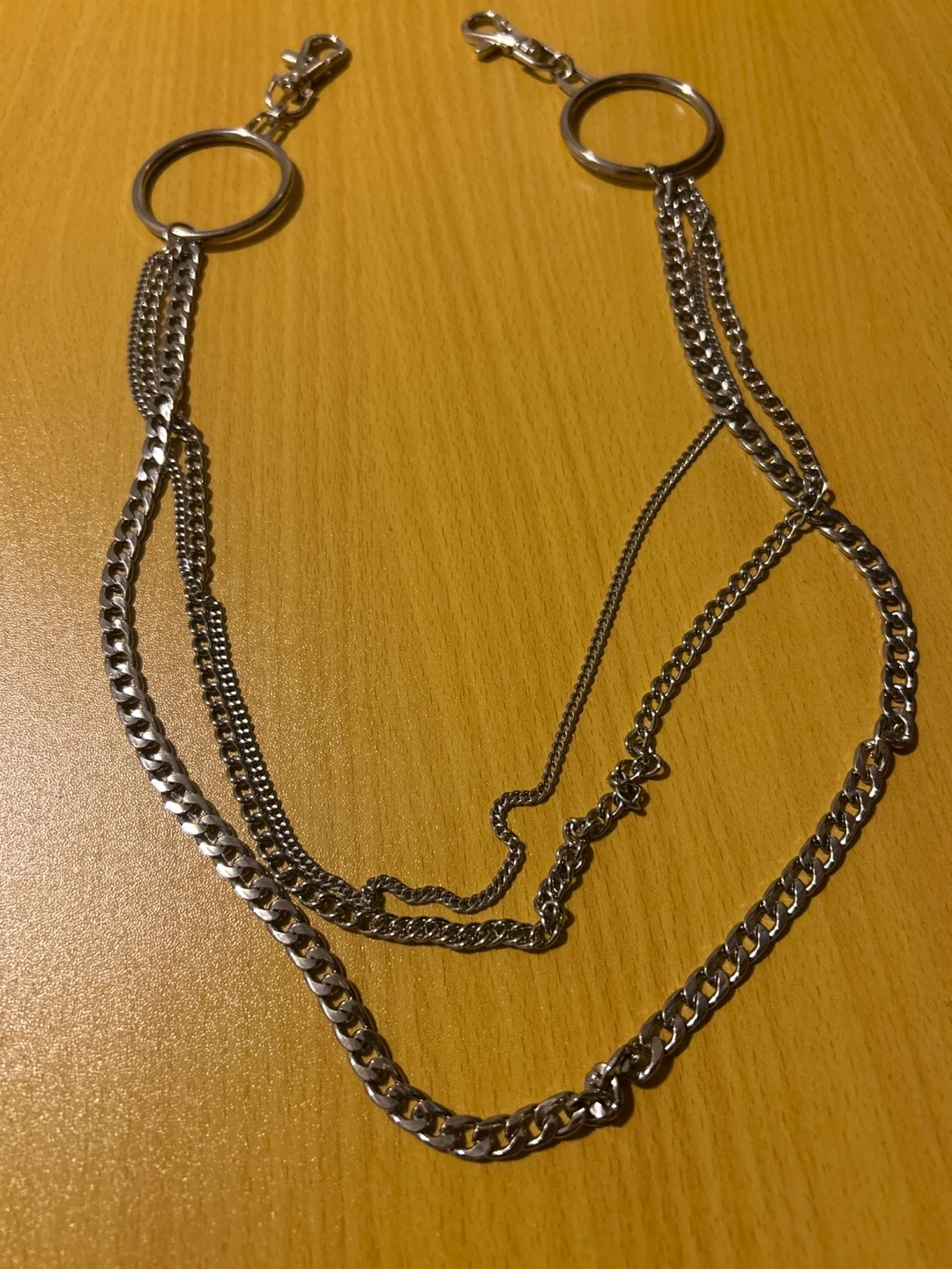 This is a layered chain belt with decorative rhinestones. It features two large rings with lobster clasp attachments. Made from silver-tone metal.