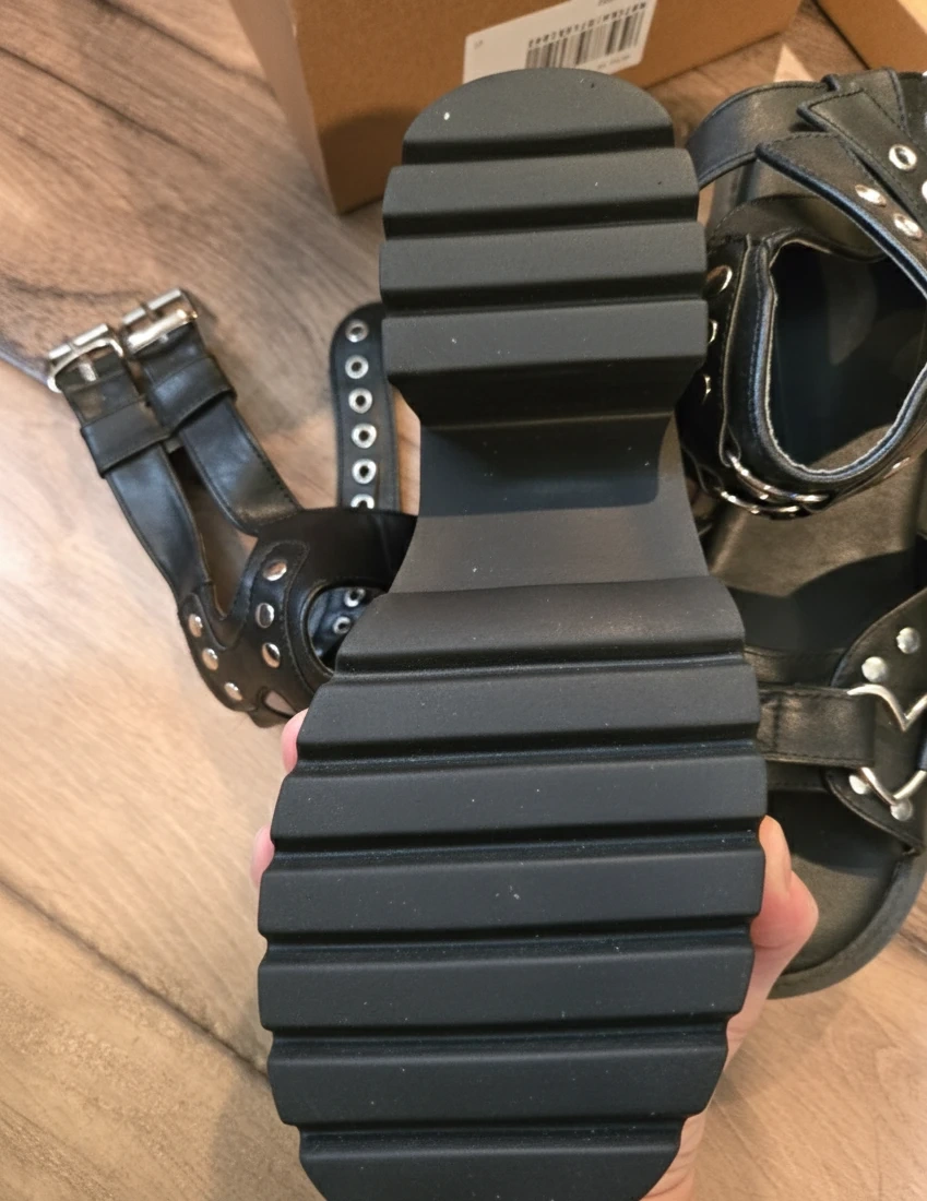 These black leather platform sandals feature a chunky heel and adjustable straps with buckle closures. They're adorned with metal studs and hardware for a bold look. Includes original box. Leather material.
