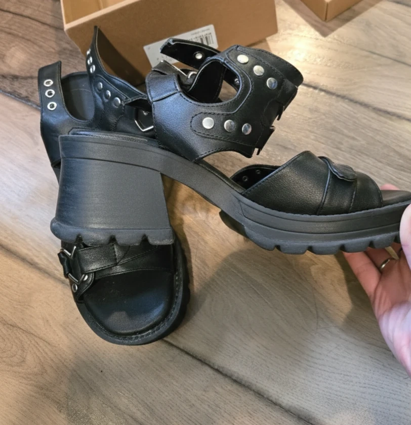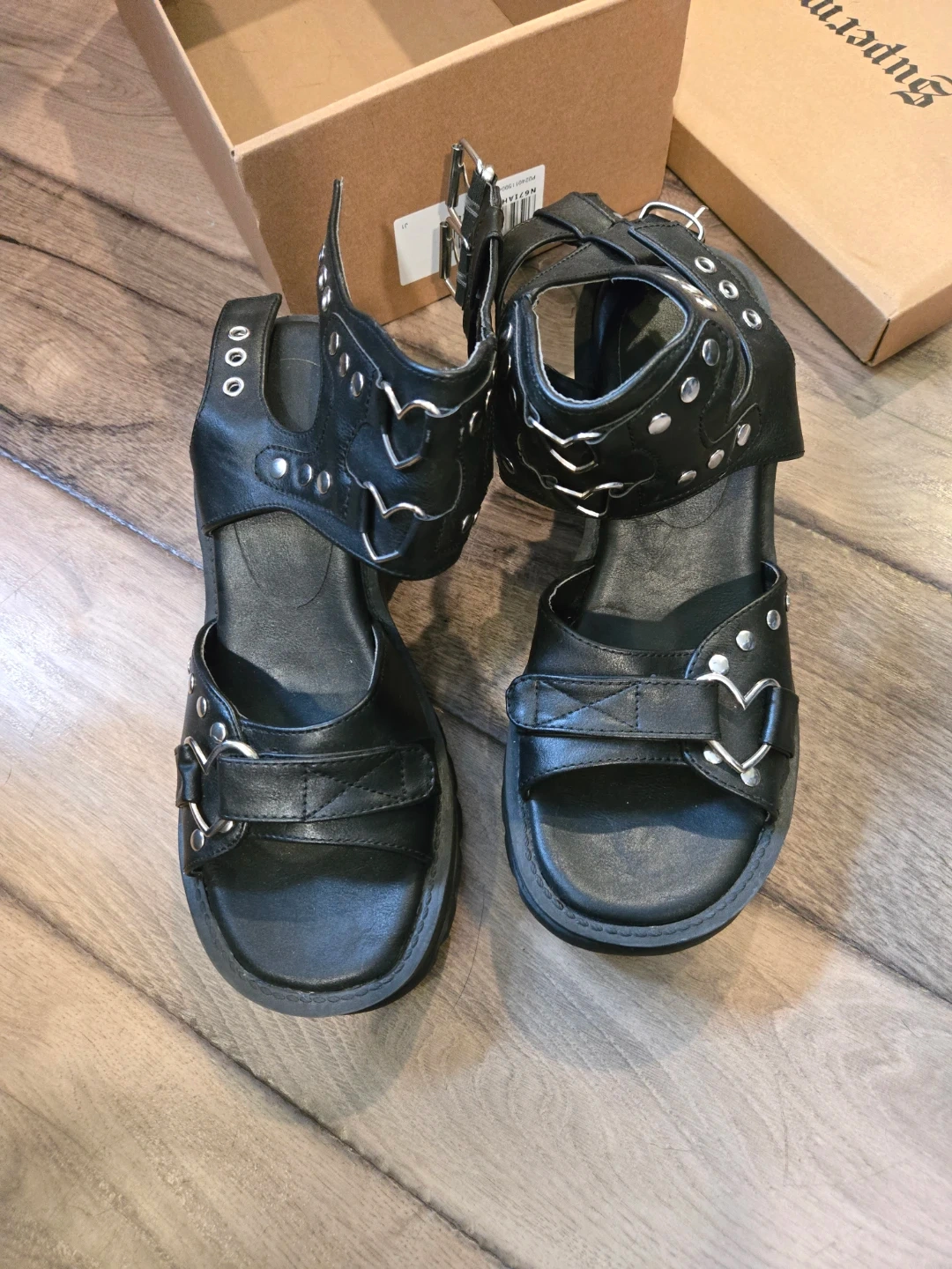 These black leather platform sandals feature a chunky heel and adjustable straps with buckle closures. They're adorned with metal studs and hardware for a bold look. Includes original box. Leather material.
