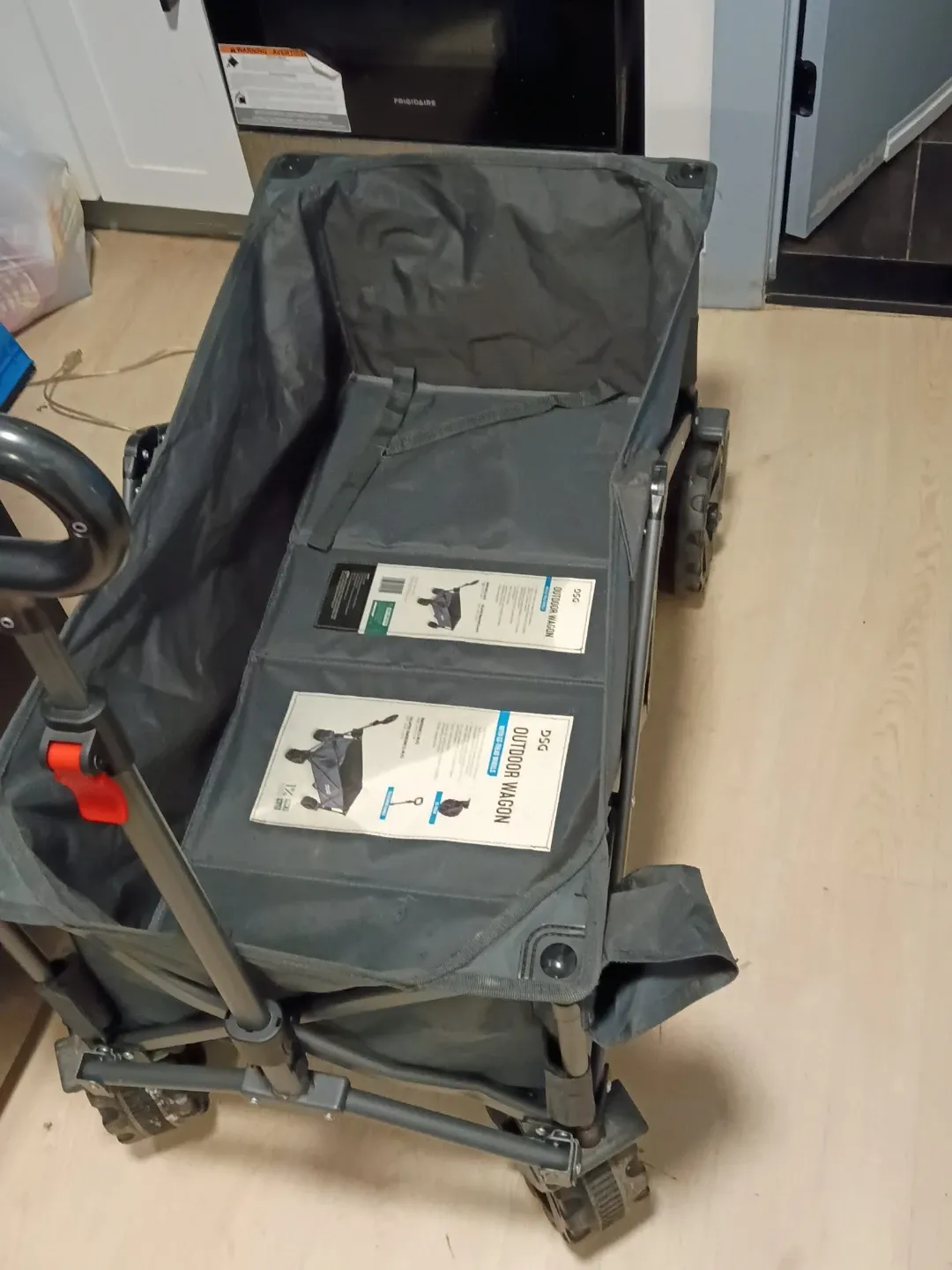 This is a DSG outdoor wagon. It features a sturdy frame and durable fabric. The wagon's large wheels make it easy to maneuver over various terrains.