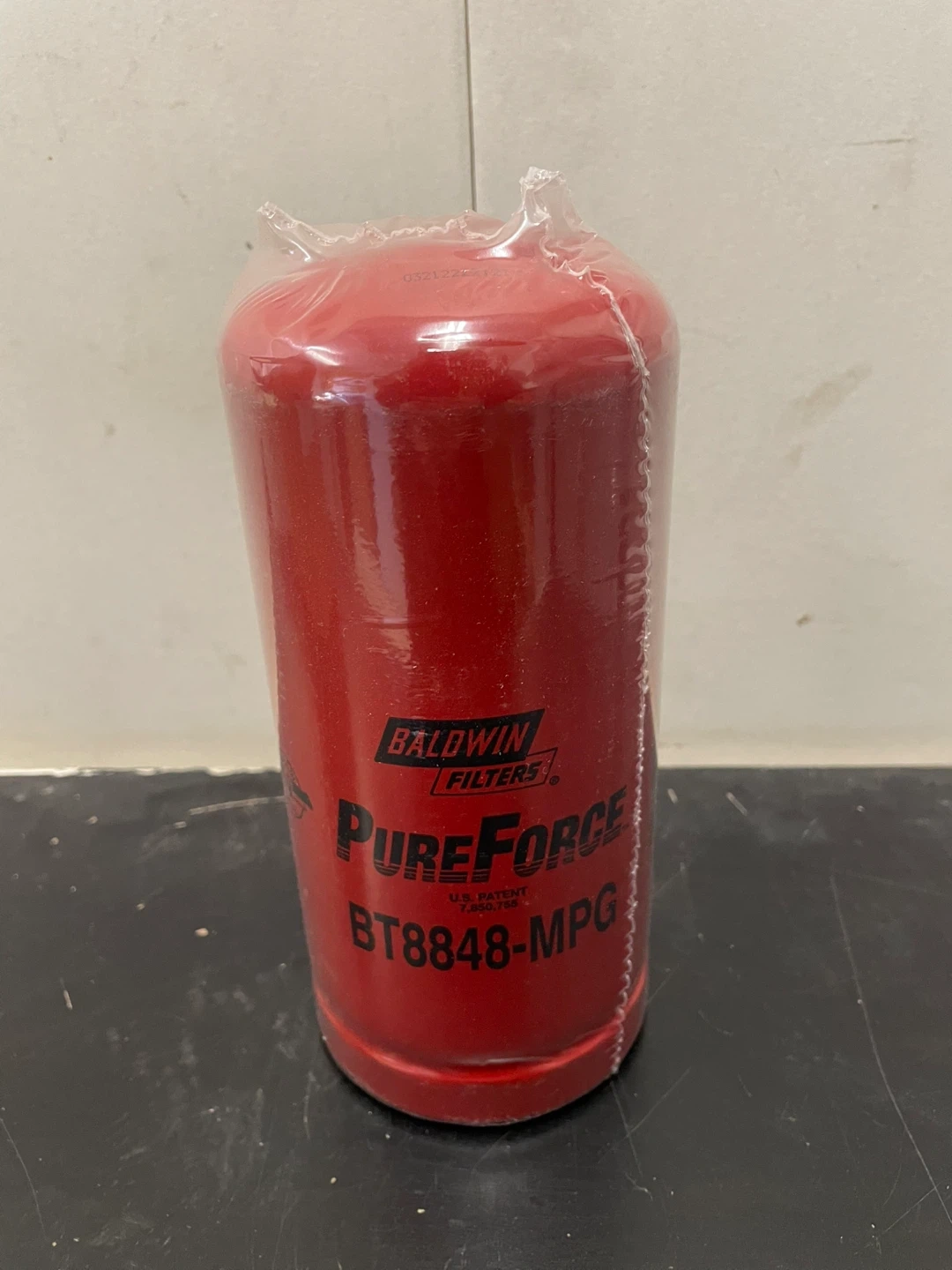 This is a Baldwin Filters BT8848-MPG hydraulic filter. It's a PureForce model made in the U.S.A. The filter is red and comes in its original box. It's suitable for use in various vehicles and machinery.
