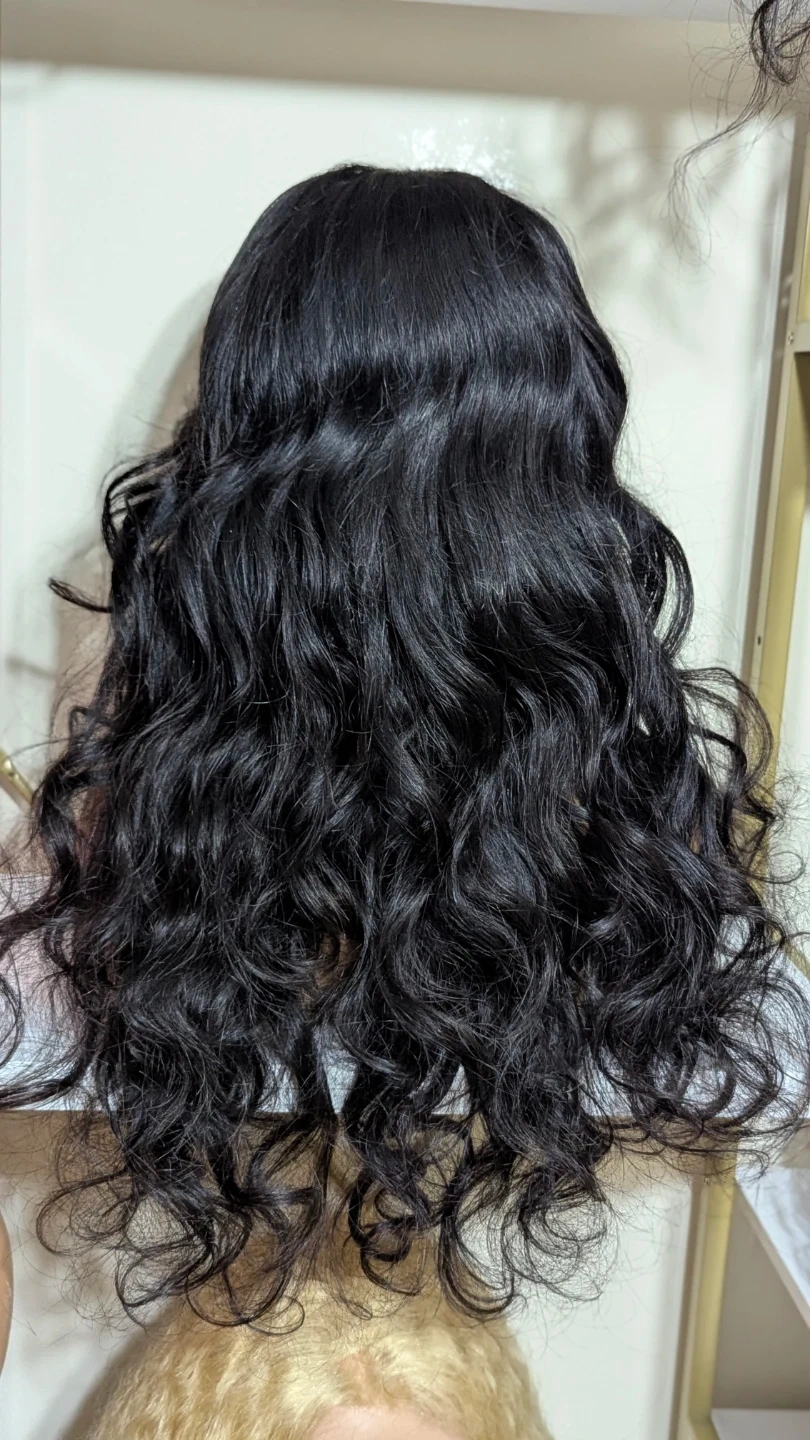 This is a beautiful black lace front wig with loose waves. It's made with human hair for a natural look and feel. It has a natural hairline and is ready for styling!