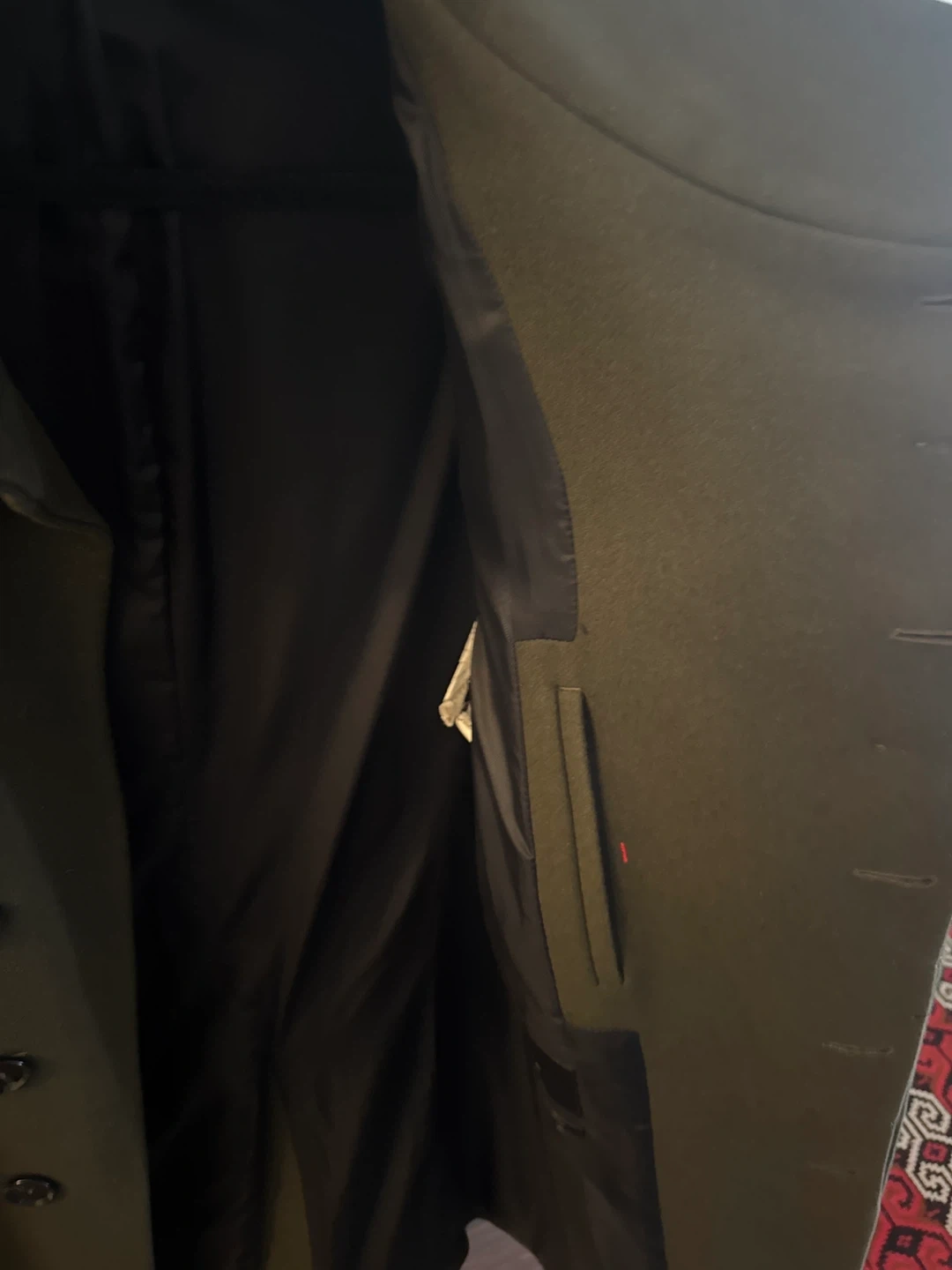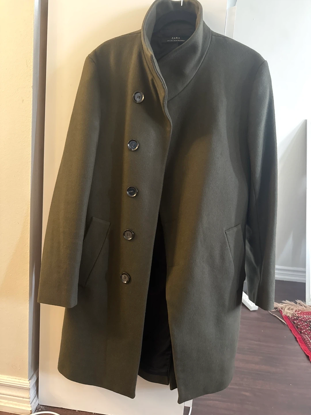 This Zara olive green colour coat . It's made from a wool blend and features a sleek, modern design with button closures. This coat is perfect for cooler weather!