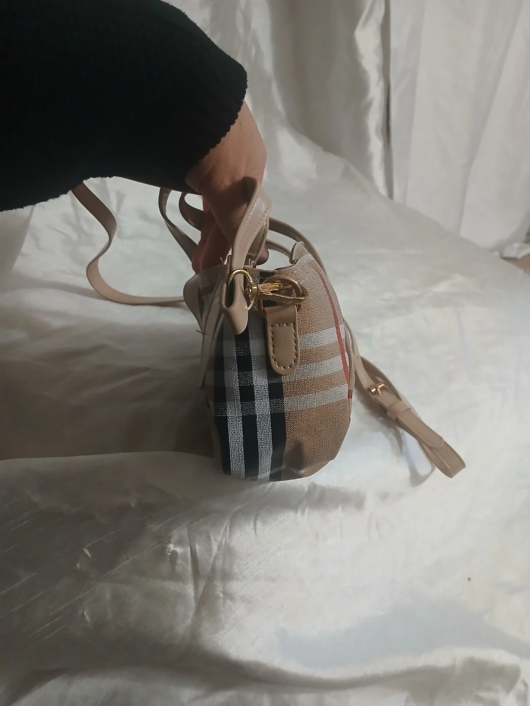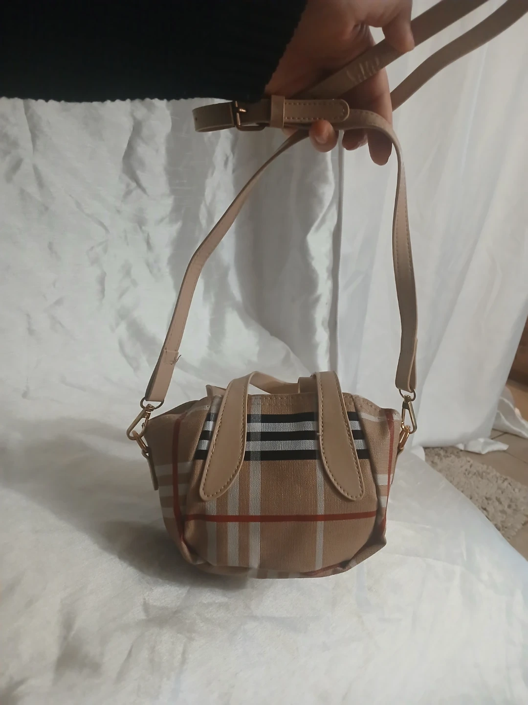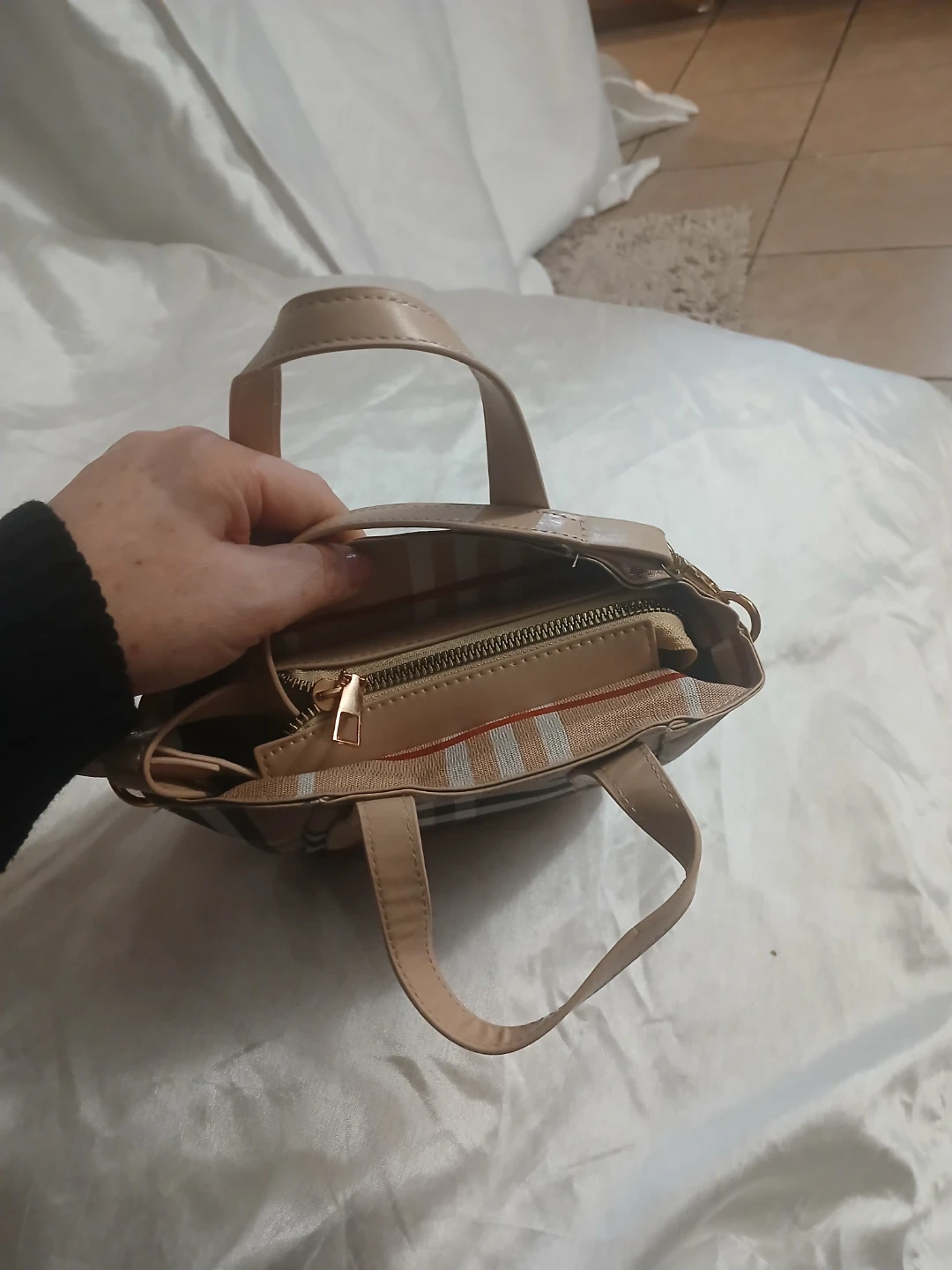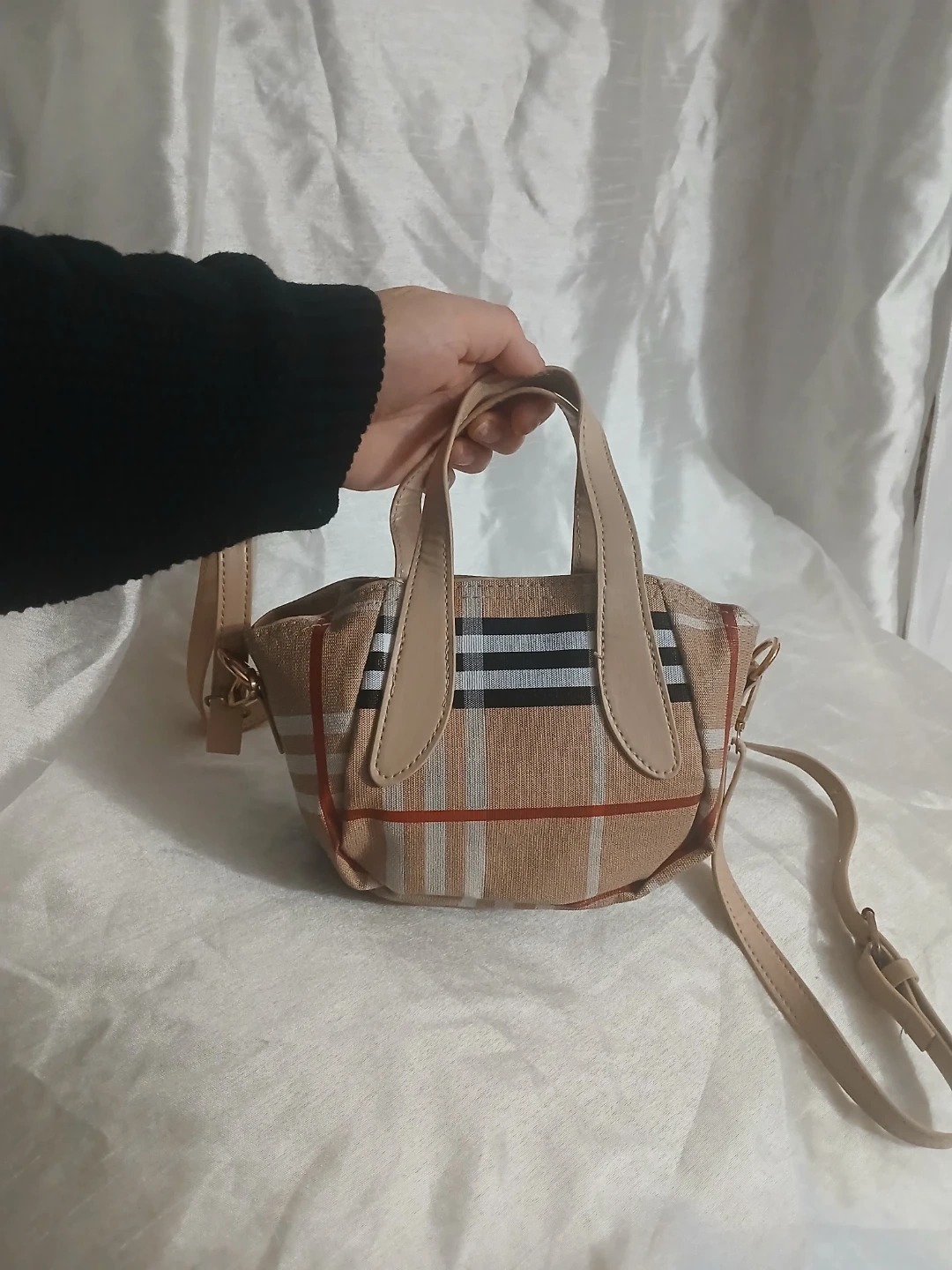 This is a cute tan mini handbag with a classic plaid pattern. It has two short top handles and a detachable crossbody strap. The interior features a zipper pocket.
