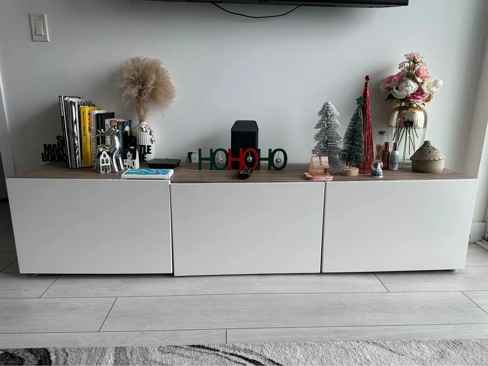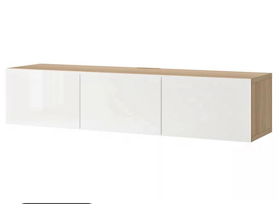 Moving sale! Selling this sleek IKEA BESTÅ TV unit. It features three spacious cabinets with clean, white high-gloss doors and a beautiful wood-effect top. Perfect for a living room media setup or as a low sideboard for extra storage.