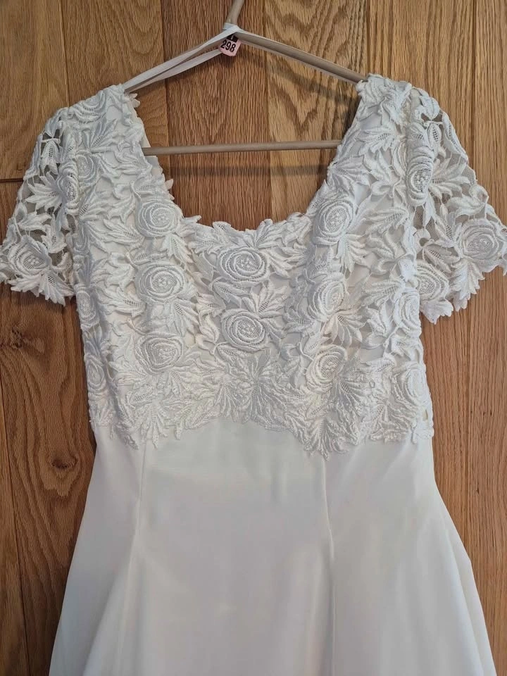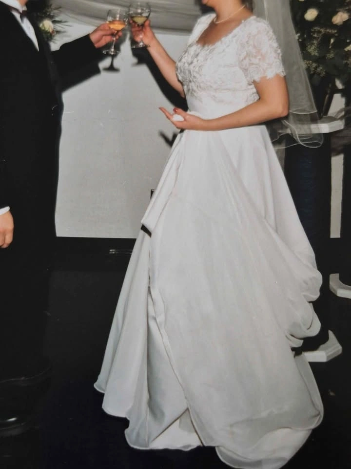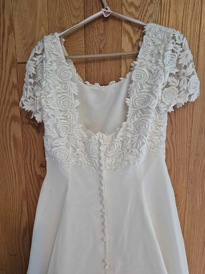 Selling my gorgeous off-white wedding gown. Its simple, elegant style will make anyone feel beautiful on their special day. The bodice features chunky rose lace that also creates short sleeves, perfect for any season, and the empire waist is flattering for every body type. The dress is satin with a sheer overlay, and a subtle crinolin underneath to create a bit of volume as it falls from the hips. The back flows into a short train which can be attached with a hidden loop to keep it out of the way while walking or dancing. This dress has been professionally cleaned, and was boxed and kept away from sunlight since my wedding in 1999. No pulls or tears in the fabric. It is, however, missing two of the back buttons as shown in the photos. Will throw in the 3", size 8, Arnold Churgin heels that were worn with it if interested. Try ons may be possible, please message me to arrange. No delivery. No holds without deposit.