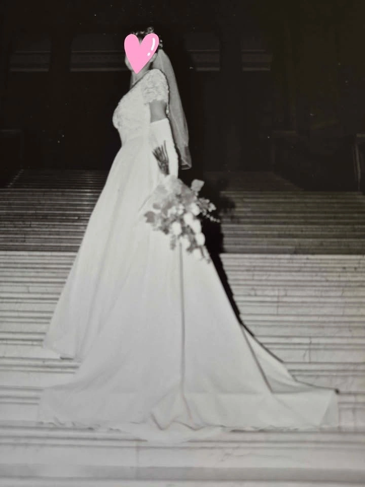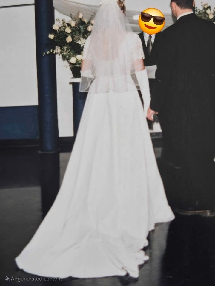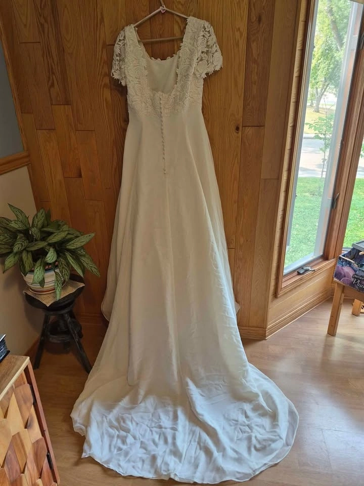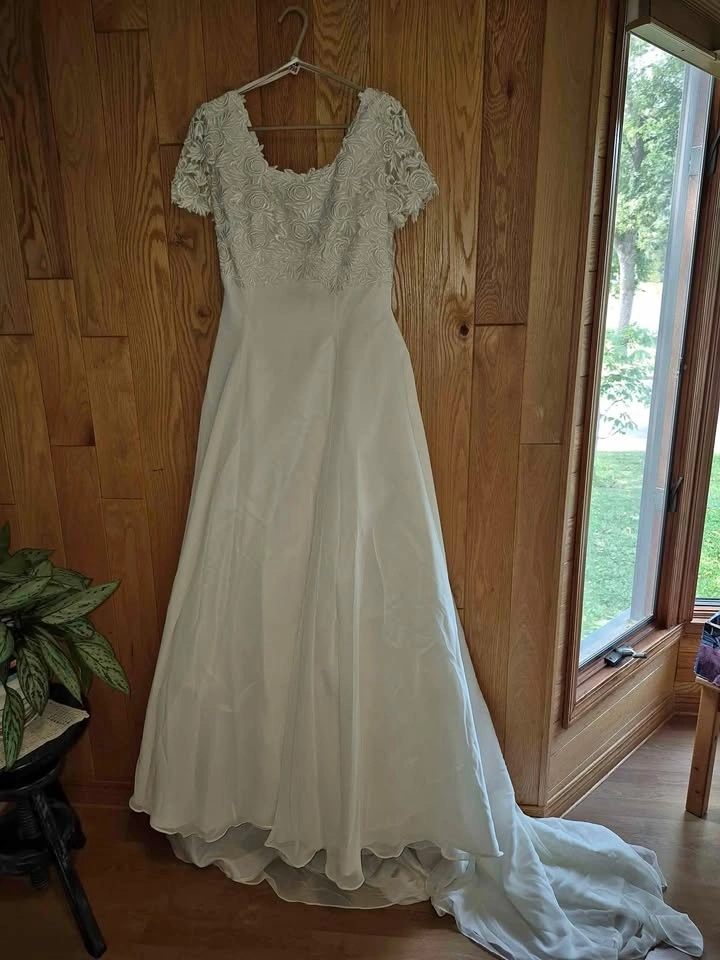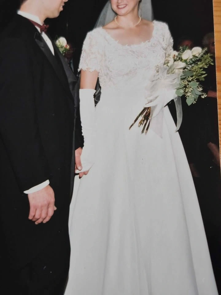 Selling my gorgeous off-white wedding gown. Its simple, elegant style will make anyone feel beautiful on their special day. The bodice features chunky rose lace that also creates short sleeves, perfect for any season, and the empire waist is flattering for every body type. The dress is satin with a sheer overlay, and a subtle crinolin underneath to create a bit of volume as it falls from the hips. The back flows into a short train which can be attached with a hidden loop to keep it out of the way while walking or dancing. This dress has been professionally cleaned, and was boxed and kept away from sunlight since my wedding in 1999. No pulls or tears in the fabric. It is, however, missing two of the back buttons as shown in the photos. Will throw in the 3", size 8, Arnold Churgin heels that were worn with it if interested. Try ons may be possible, please message me to arrange. No delivery. No holds without deposit.