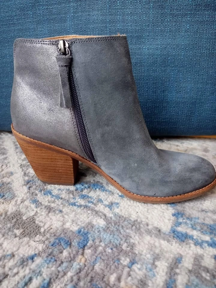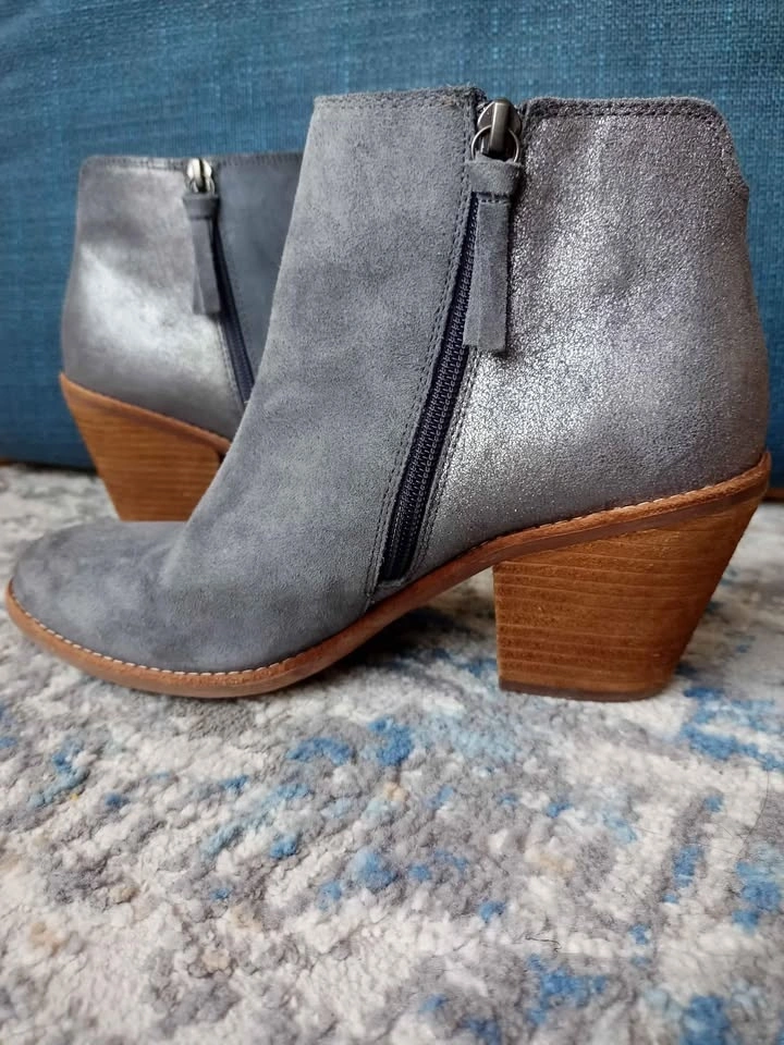 Like new, these pretty gray suede booties are in excellent condition. Soft gray fronts with silver-gray suede backs, suede zipper pulls and 3" leather-wrapped heels provide gorgeous, fashionable comfort. The neutral colour goes with everything from casual jeans to dressier occasions. Sofft is known for their padded insoles that keep your feet comfortable all day long. Rubber soles help absorb shock and provide grip on most surfaces. Pick up in Sherwood Park.