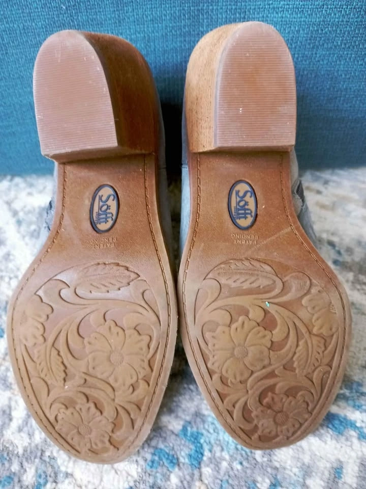 Like new, these pretty gray suede booties are in excellent condition. Soft gray fronts with silver-gray suede backs, suede zipper pulls and 3" leather-wrapped heels provide gorgeous, fashionable comfort. The neutral colour goes with everything from casual jeans to dressier occasions. Sofft is known for their padded insoles that keep your feet comfortable all day long. Rubber soles help absorb shock and provide grip on most surfaces. Pick up in Sherwood Park.