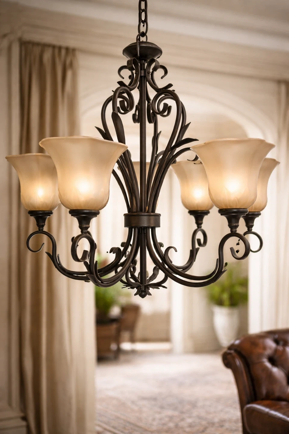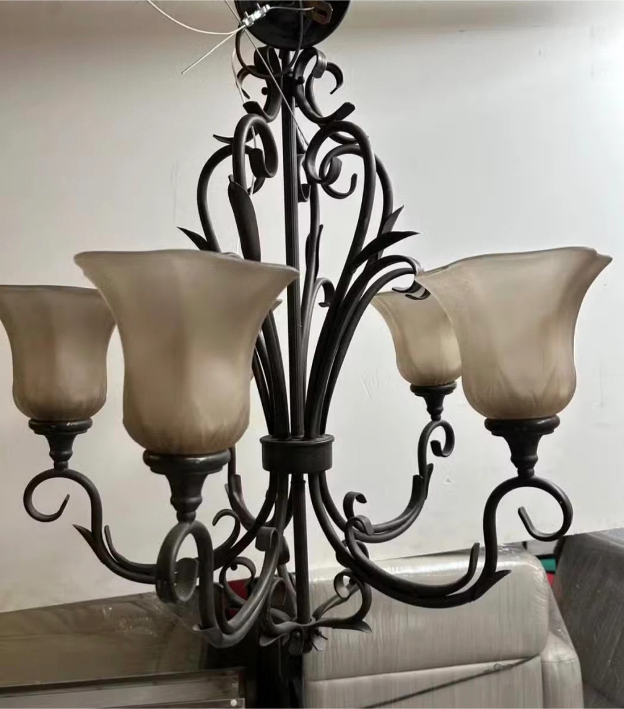 This is a 5-light chandelier with a dark metal finish. It features frosted glass shades. It's designed to add an elegant touch to any room.
