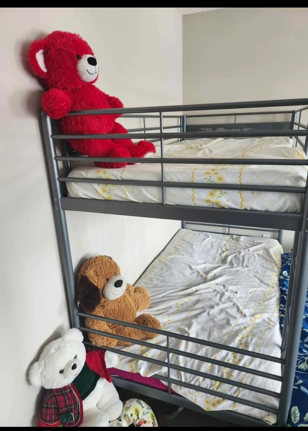 This IKEA SVÄRTA bunk bed is built with a durable metal frame. It's perfect for kids' rooms or small spaces needing to maximize sleeping areas. The ladder provides easy access to the top bunk.