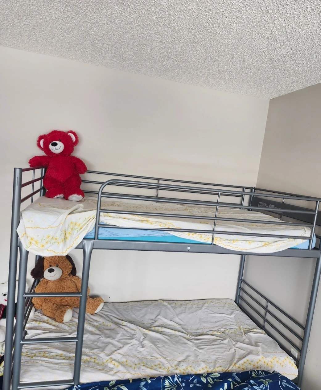 This IKEA SVÄRTA bunk bed is built with a durable metal frame. It's perfect for kids' rooms or small spaces needing to maximize sleeping areas. The ladder provides easy access to the top bunk.