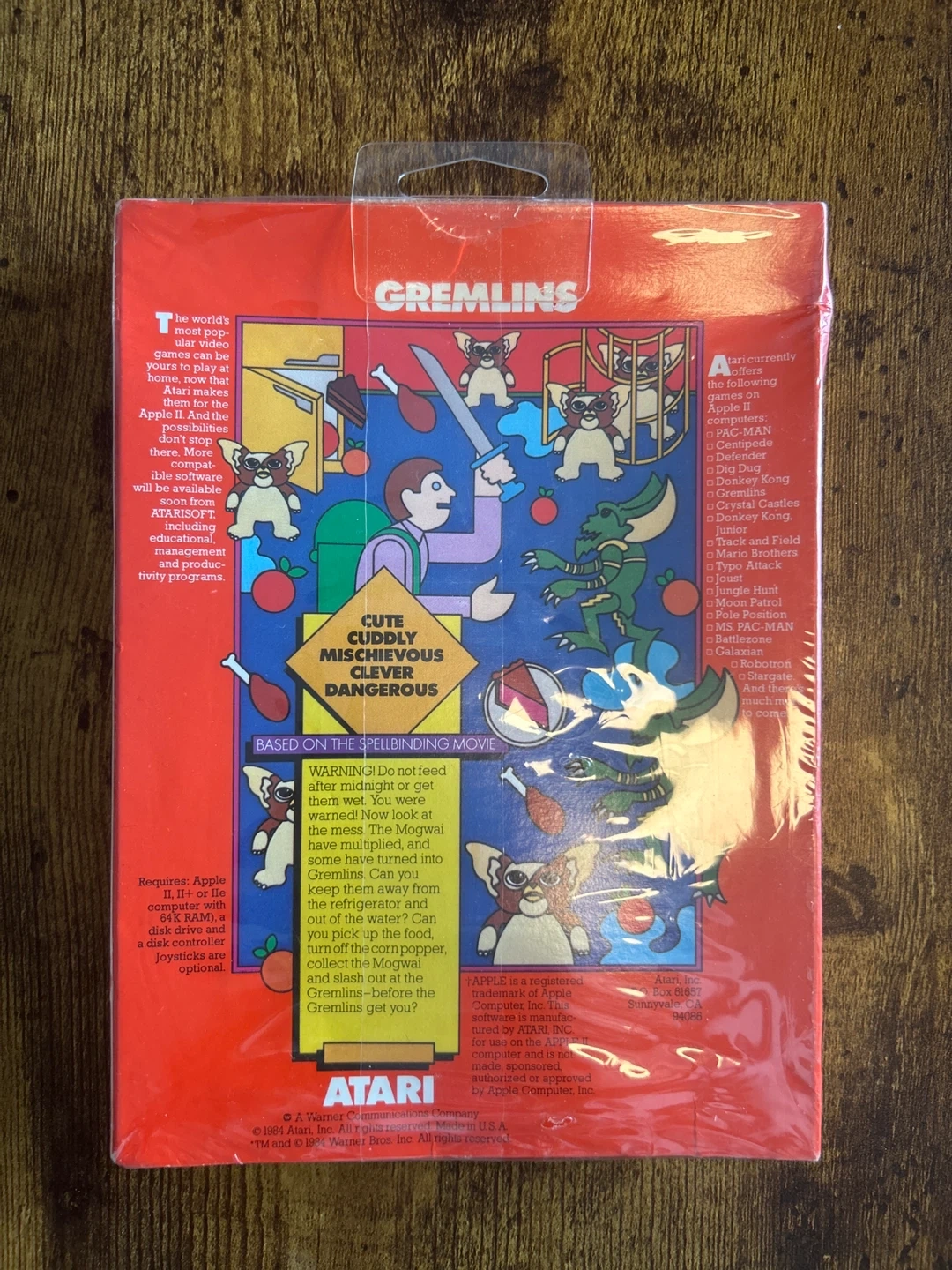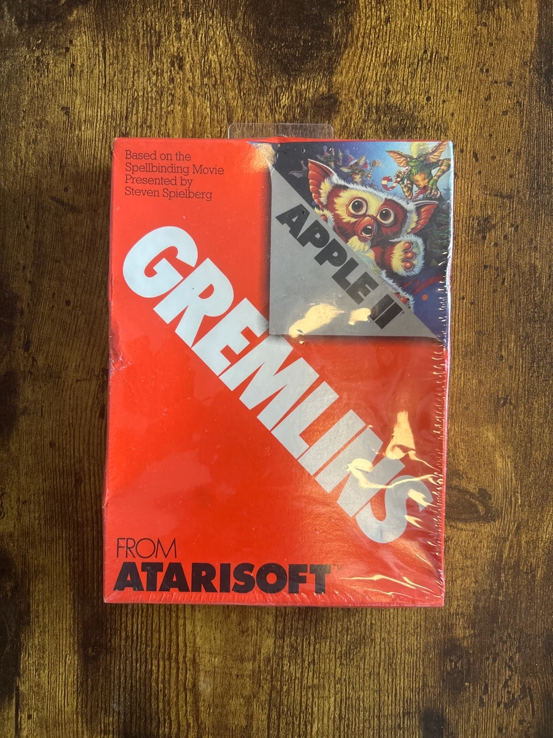 This is the Gremlins game for Apple II computers, made by AtariSoft. It's based on the popular movie. Requires an Apple computer with a disk drive and optional joystick controller. Never been used, still in box.
