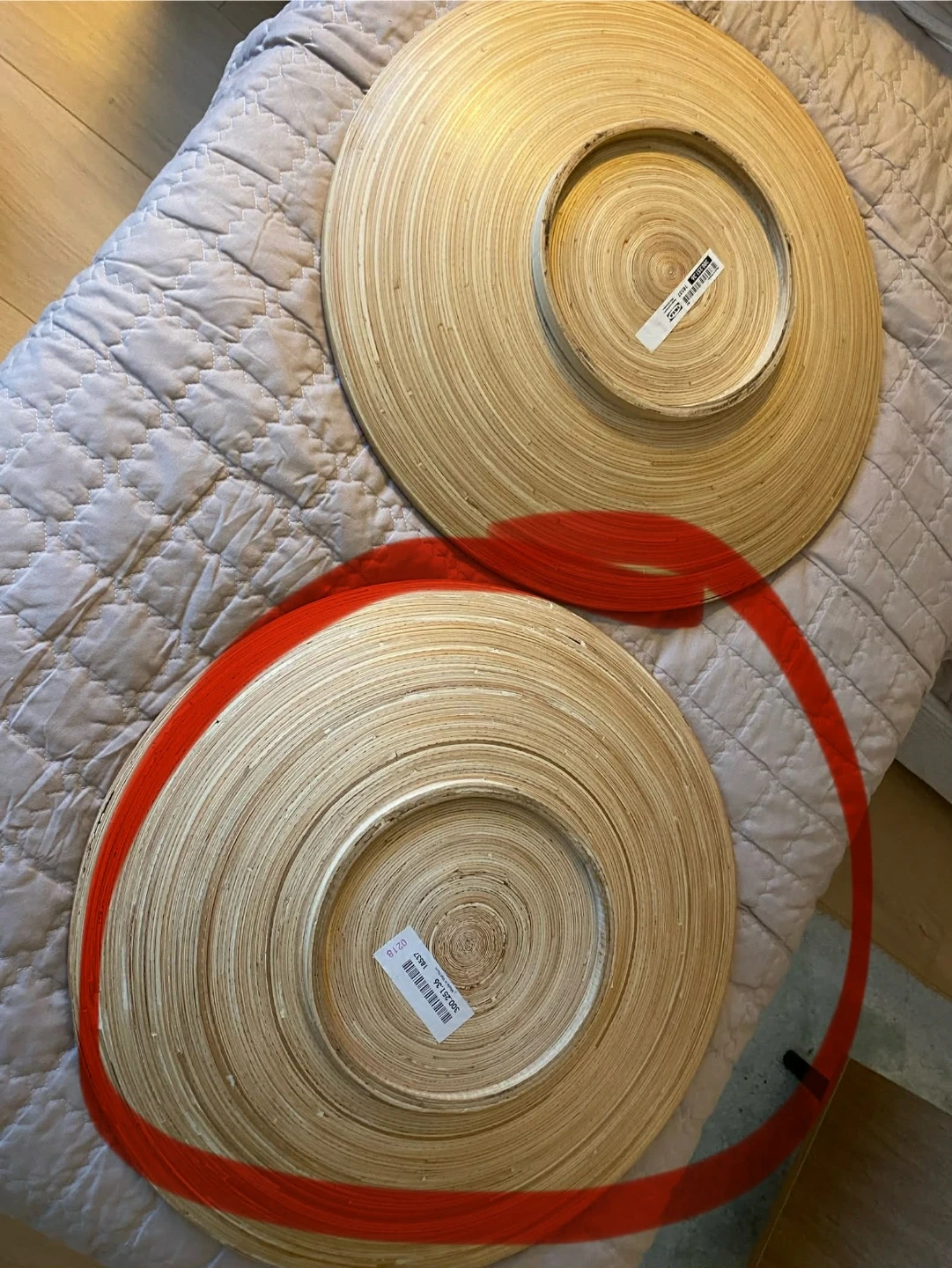 ONE large bamboo bowl - circled in red (the other is already sold). It has a natural wood grain finish. There's a slight marking in the center, as shown in photo, but other than that, it's like new. Used lightly during holiday seasons only and packed away for most of the rest. Great for entertaining or as a decorative piece.