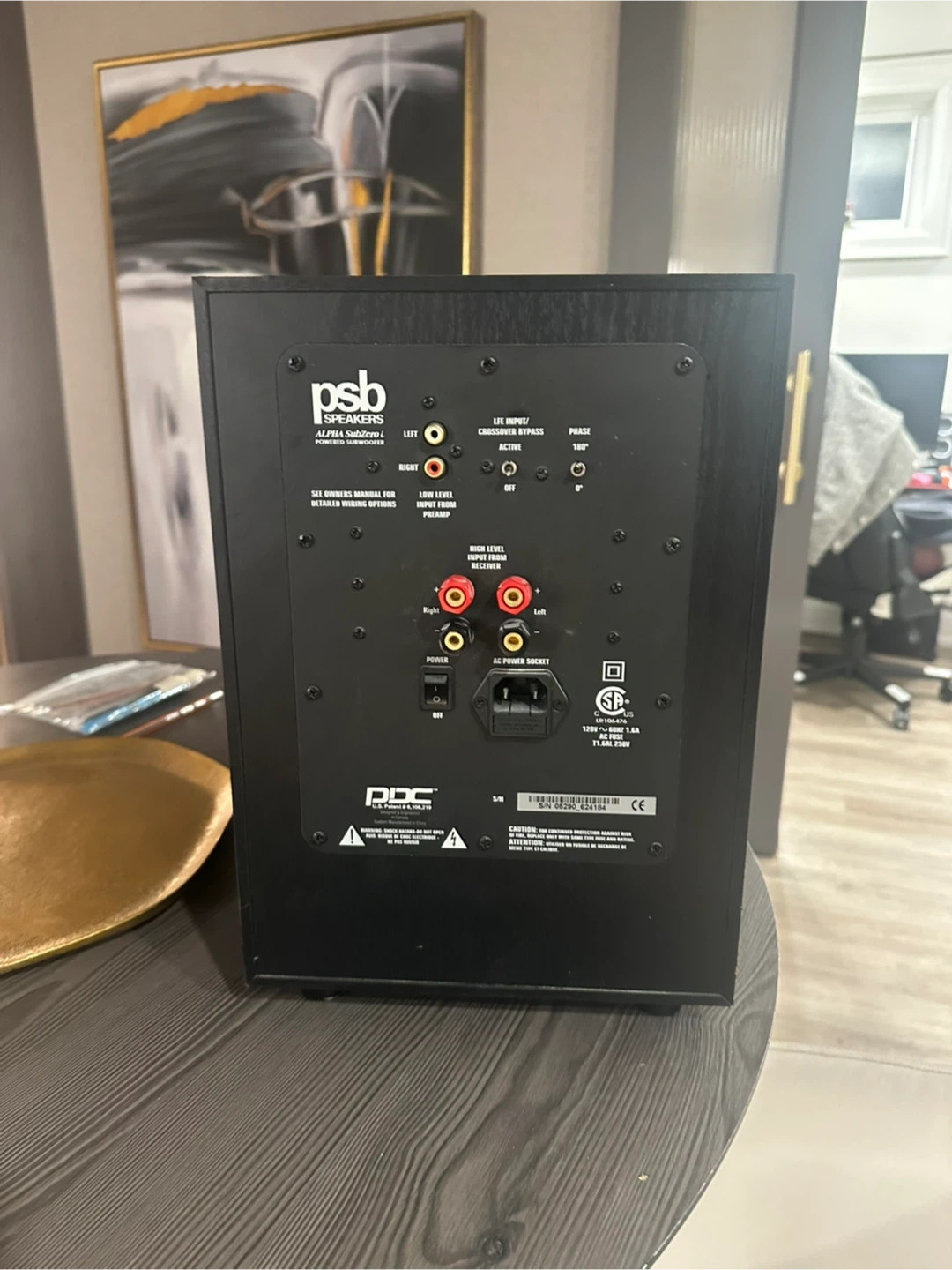 This is a PSB Speakers Alpha SubSeries 1 powered subwoofer. It has a black finish and a front-firing port. Connections include LFE input, RCA line level inputs, and speaker level inputs. It's great for enhancing your home theatre sound system!