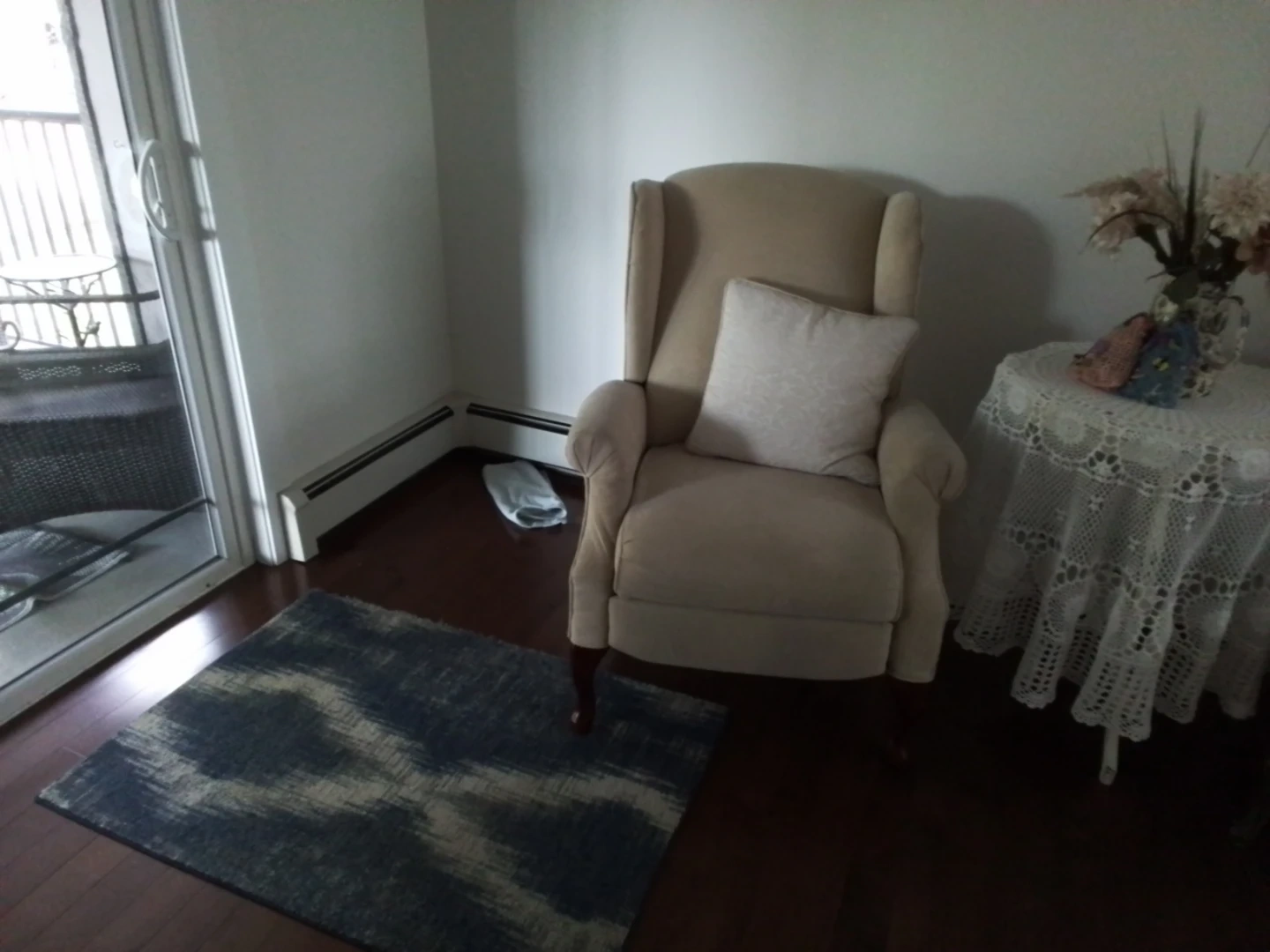 Soft beige recliner chair. It's comfortable and has a classic wingback design. This chair's footrest extends for extra relaxation. Great for a cozy living room! Small apt size.