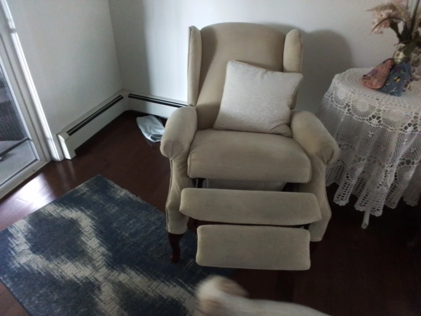 Soft beige recliner chair. It's comfortable and has a classic wingback design. This chair's footrest extends for extra relaxation. Great for a cozy living room! Small apt size.
