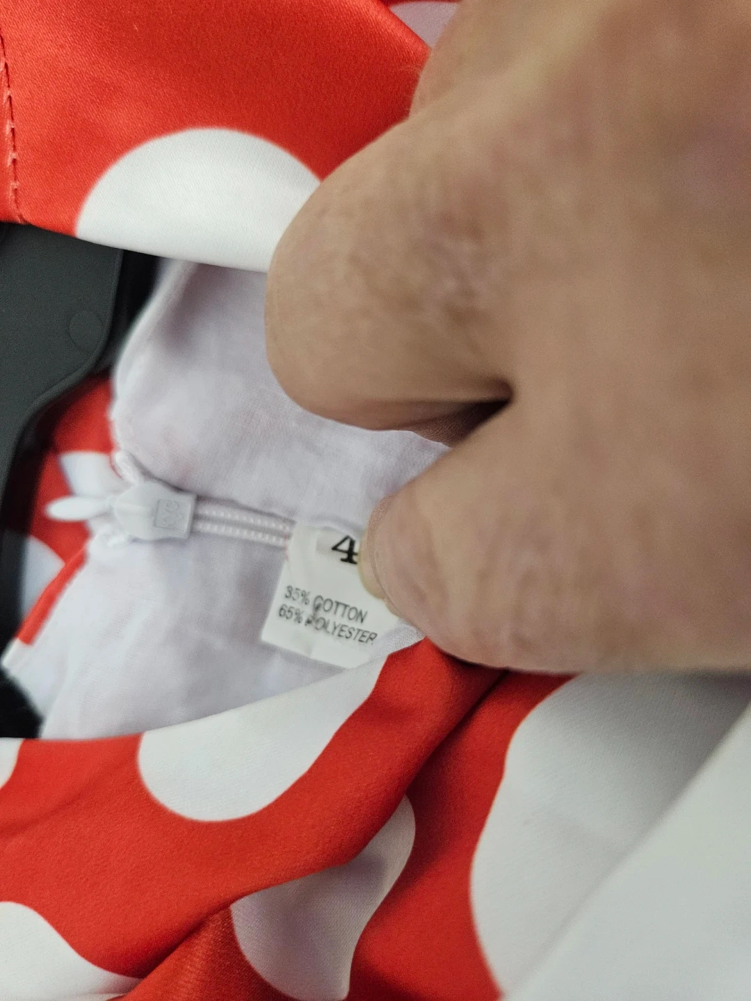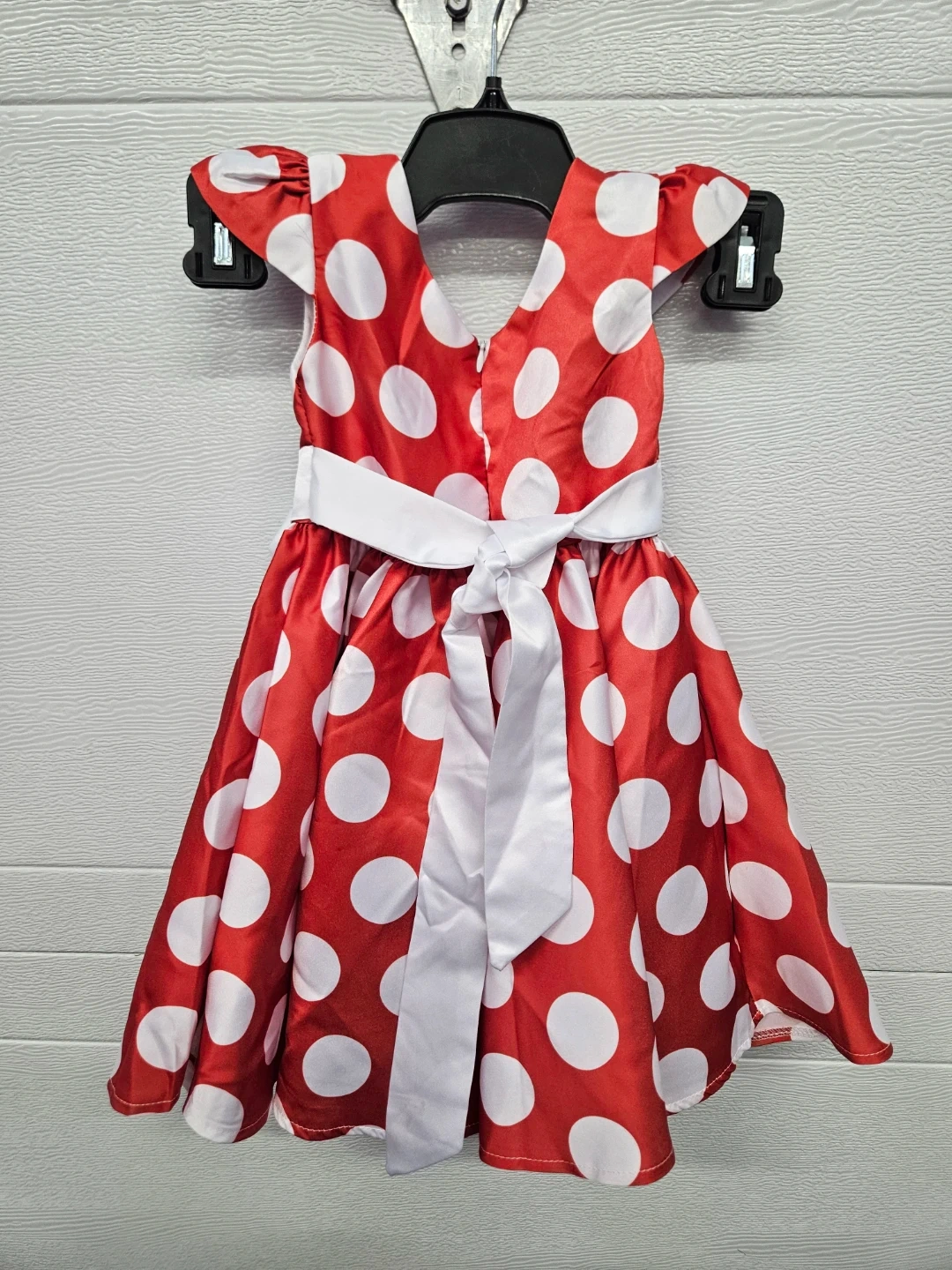 Cute red and white polka dot dress with a white sash and bow. Made with 35% cotton and 65% polyester. Great for special occasions or everyday fun!