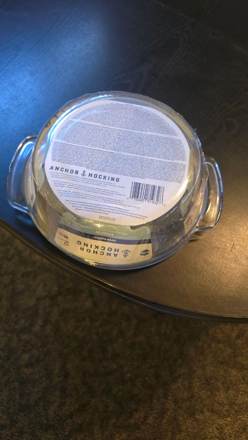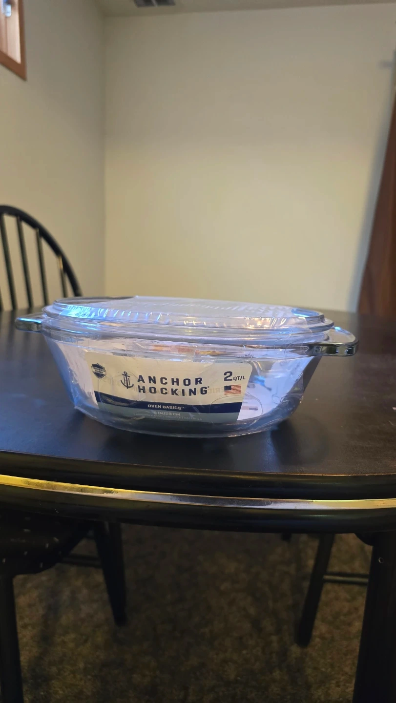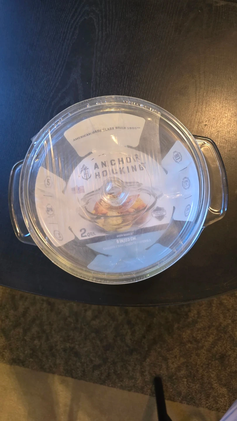 Anchor Hocking oven basics glass baking dish. It's 2 quart capacity and made in the USA. Dish is 9 inches in diameter. Unopened/ unused. Comes with lid.