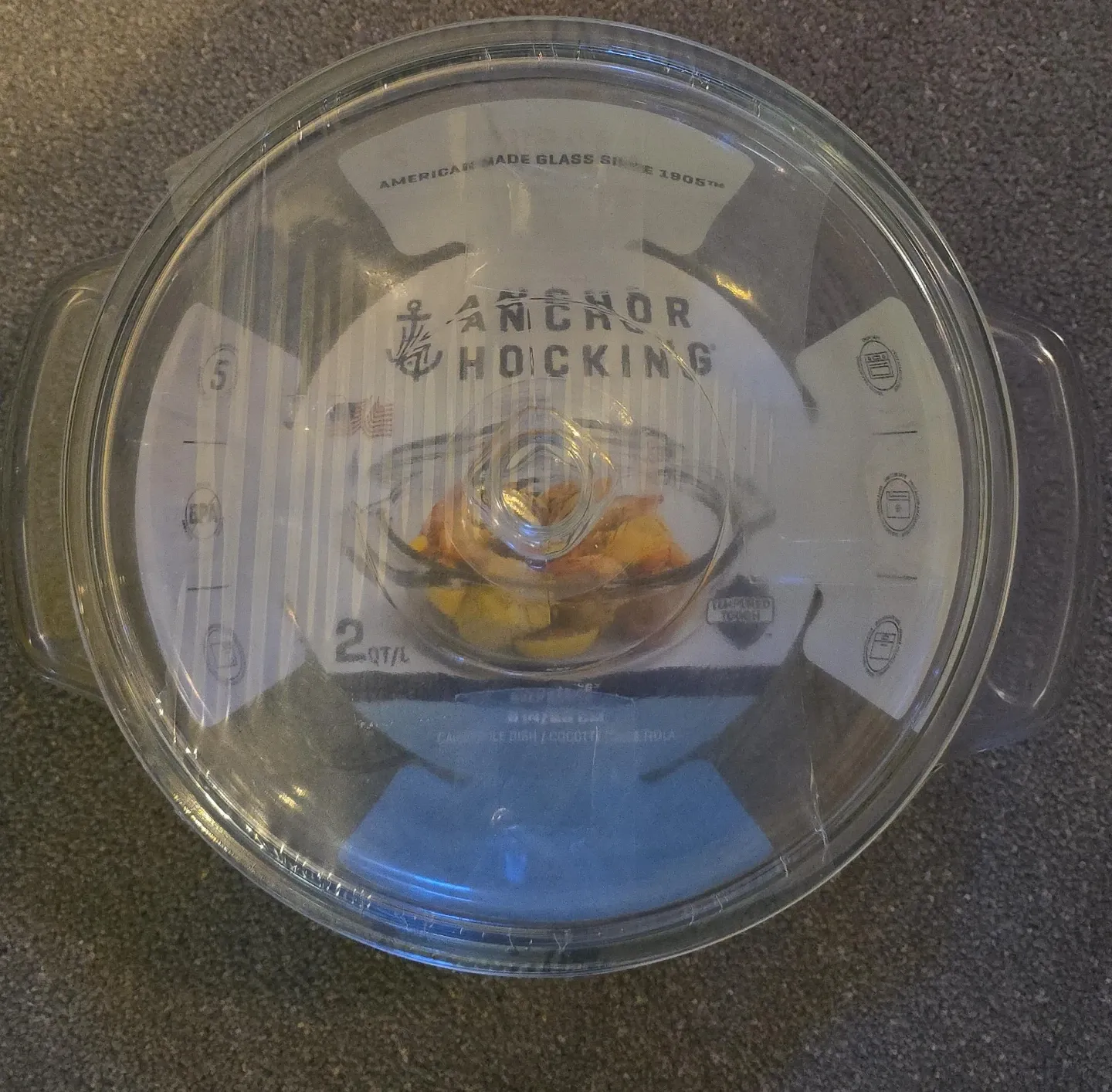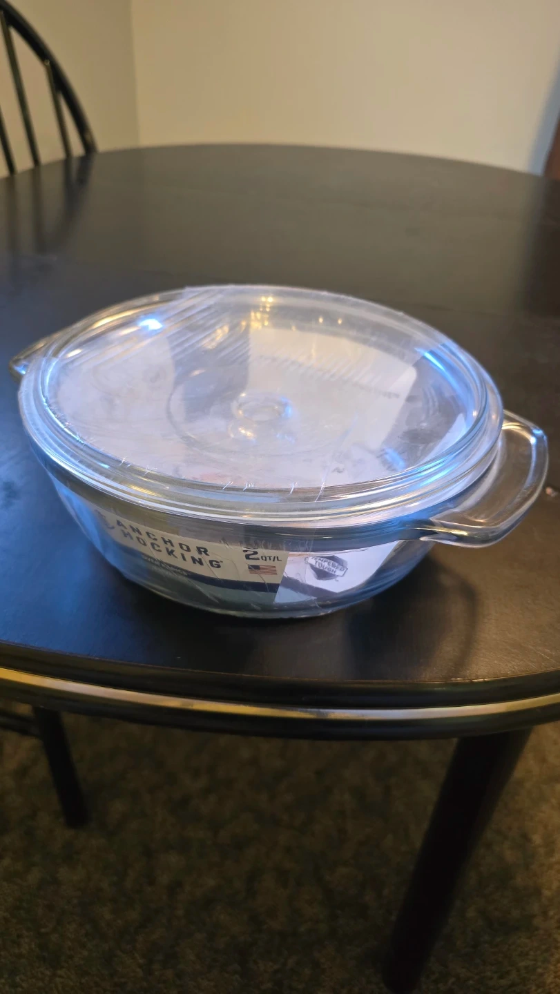 Anchor Hocking oven basics glass baking dish. It's 2 quart capacity and made in the USA. Dish is 9 inches in diameter. Unopened/ unused. Comes with lid.