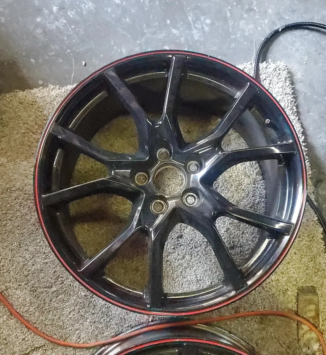 Single black alloy wheel with a red accent around the rim. It has a multi-spoke design. This wheel is sold individually.