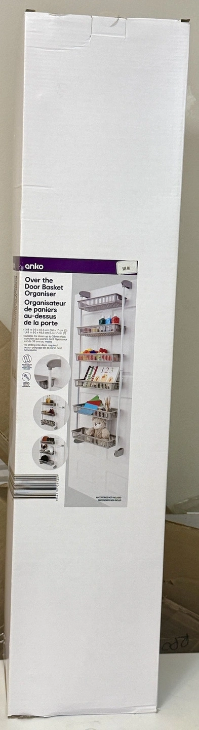 This 6-tier over the door basket organizer fits doors up to 38mm thick. Overall dimensions are 148.5cm (H) x 45.5cm (W) x 17cm (D), with each basket measuring 7cm (H) x 41cm (W) x 16cm (D). It has a sturdy frame and classic design, suitable for most doors. Easily hang it over the door to add extra storage space in your bathroom, bedroom, or kitchen. Assembly is simple with no tools required; just hang it on your door. The parts that touch the door are padded to prevent scratches. The distance between baskets is adjustable to your needs. You can remove a basket for a higher shelf or use it separately as a spice rack or for small items in the garage. Each basket can hold up to 2 kg, keeping daily objects handy. This stylish organizer is versatile for back-of-door storage and suits any interior style. Use it as a kitchen spice rack, to arrange toiletries, or organize cleaning products in the laundry room. Made from a strong antirust iron frame with high-quality plastic baskets. The overall bearing capacity is strong and it's not easy to deform. The wire baskets have a closed design to prevent items from falling. Price: $30.