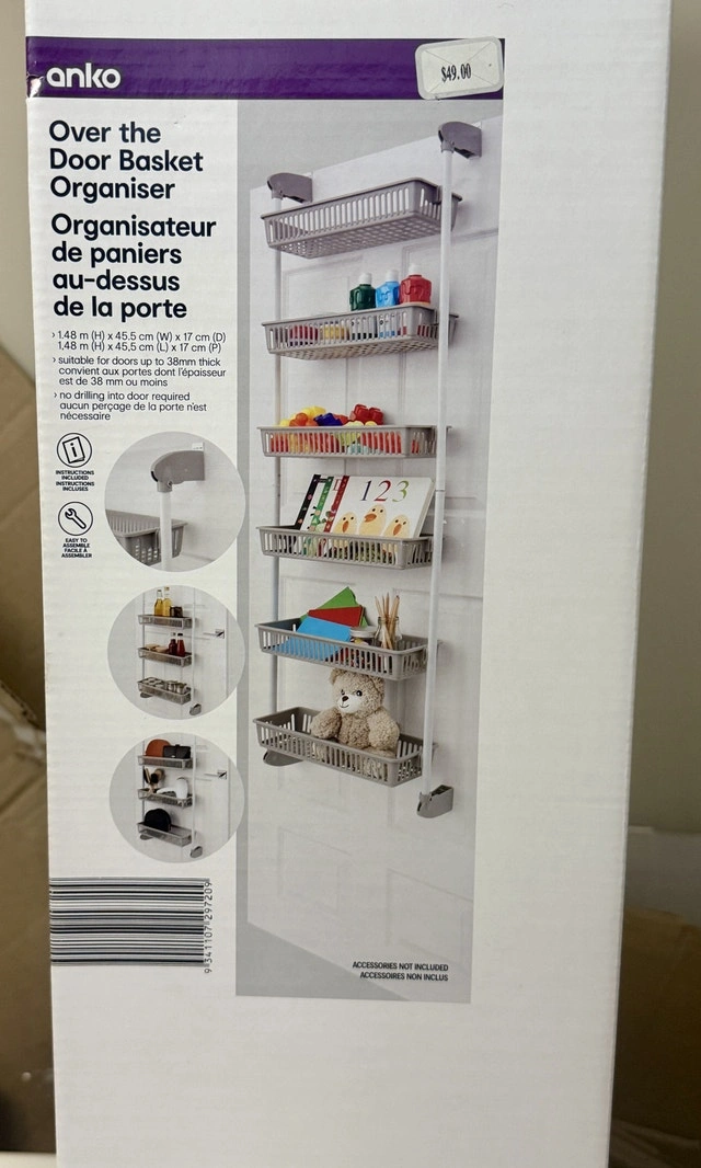 This 6-tier over the door basket organizer fits doors up to 38mm thick. Overall dimensions are 148.5cm (H) x 45.5cm (W) x 17cm (D), with each basket measuring 7cm (H) x 41cm (W) x 16cm (D). It has a sturdy frame and classic design, suitable for most doors. Easily hang it over the door to add extra storage space in your bathroom, bedroom, or kitchen. Assembly is simple with no tools required; just hang it on your door. The parts that touch the door are padded to prevent scratches. The distance between baskets is adjustable to your needs. You can remove a basket for a higher shelf or use it separately as a spice rack or for small items in the garage. Each basket can hold up to 2 kg, keeping daily objects handy. This stylish organizer is versatile for back-of-door storage and suits any interior style. Use it as a kitchen spice rack, to arrange toiletries, or organize cleaning products in the laundry room. Made from a strong antirust iron frame with high-quality plastic baskets. The overall bearing capacity is strong and it's not easy to deform. The wire baskets have a closed design to prevent items from falling. Price: $30.
