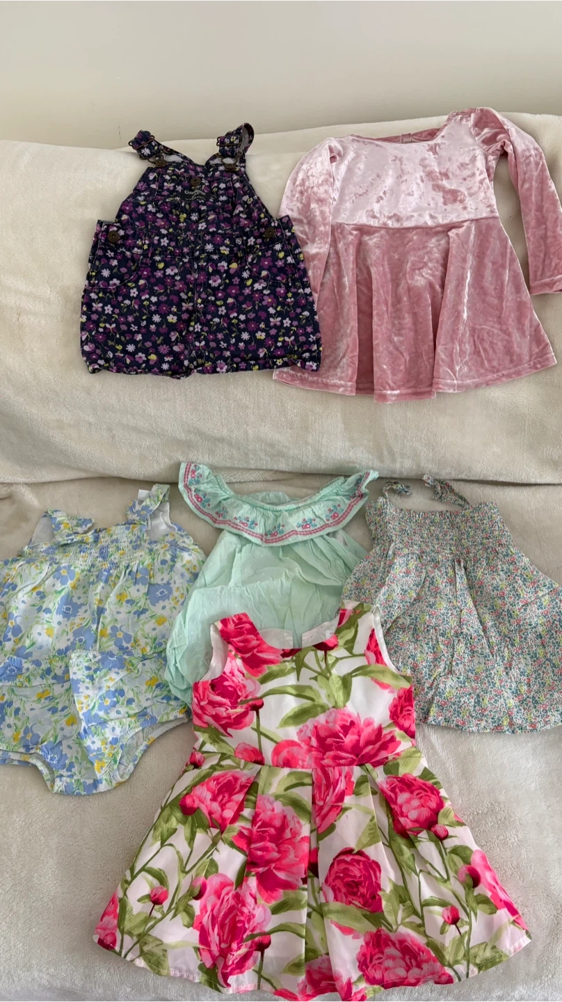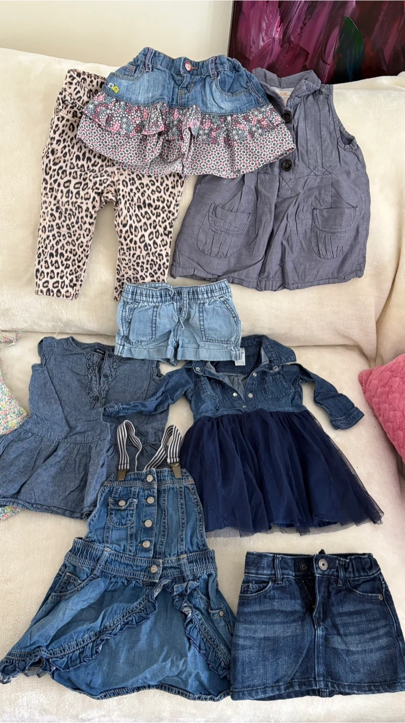 A collection of various dresses, pants, shorts, and a skirt for a little girl. Includes denim, floral prints, and velvet textures. Sizes appear to be toddler/young child.