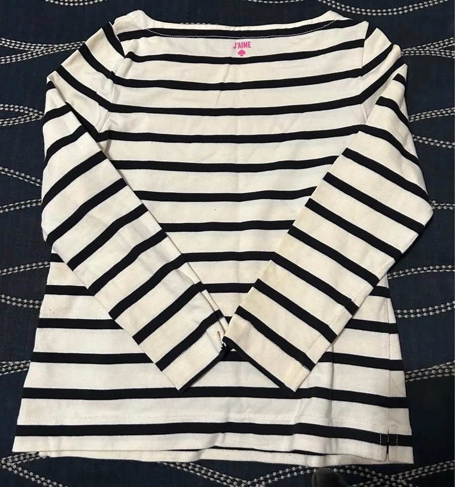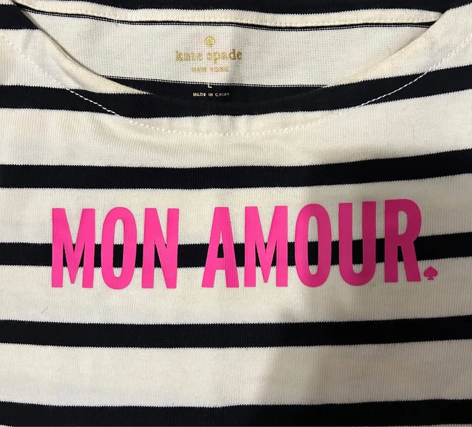 Perfect for Valentine’s Day! This is a beautiful new Kate Spade Roanne striped boat neck top. Front reads “Mon Amour.” Size large.
