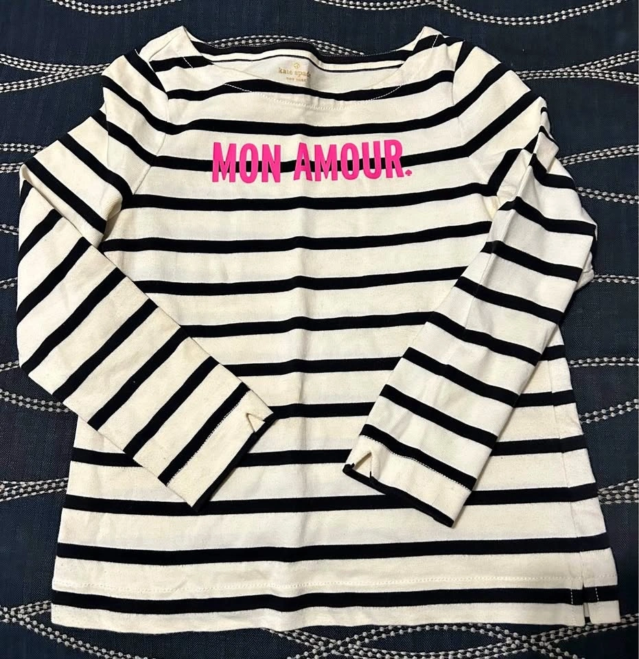 Perfect for Valentine’s Day! This is a beautiful new Kate Spade Roanne striped boat neck top. Front reads “Mon Amour.” Size large.