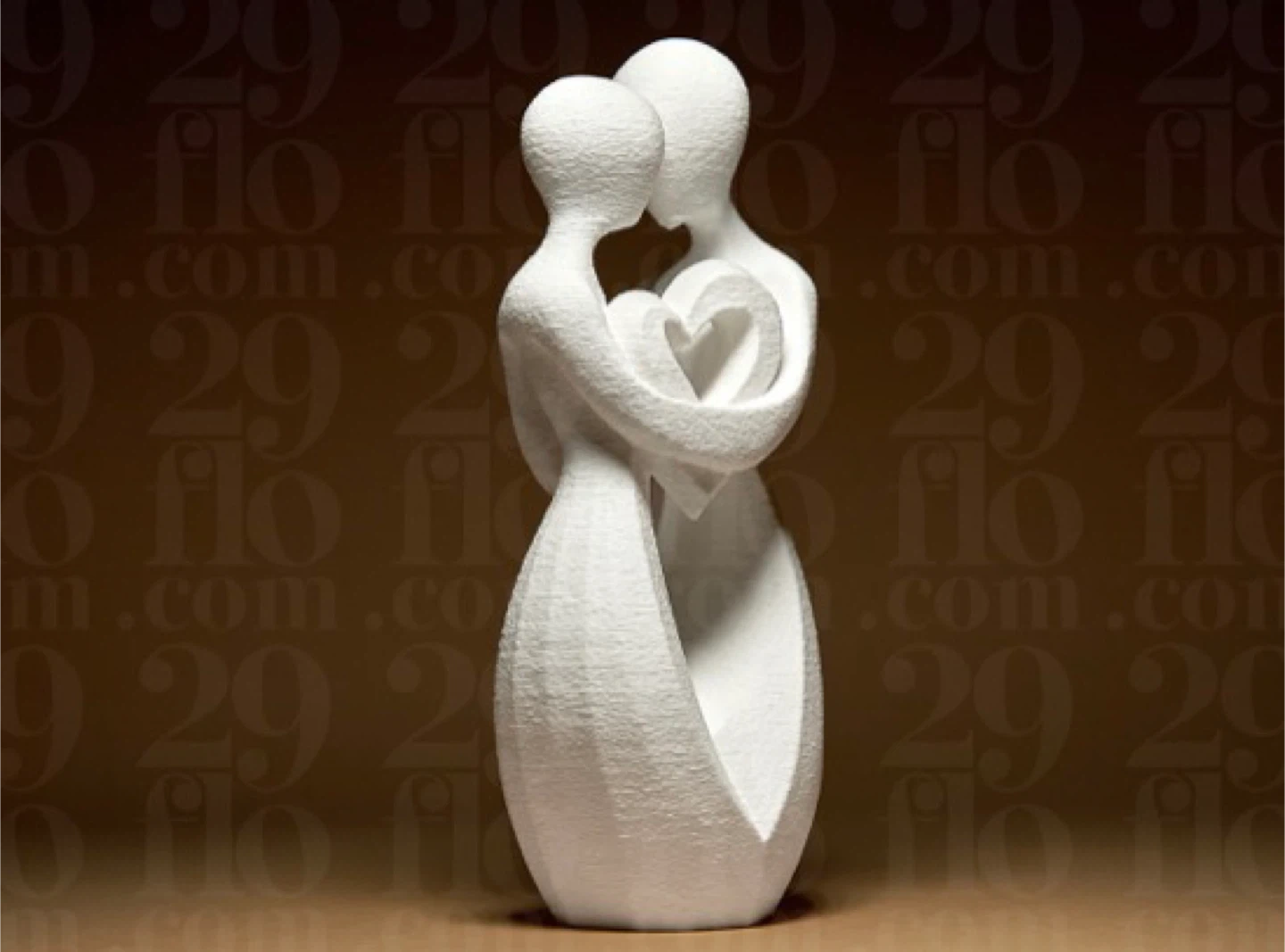 A modern abstract sculpture depicting a couple embracing and holding a heart. It's made of a white, textured material. This piece would make a lovely decorative accent for any home. Can customize colours