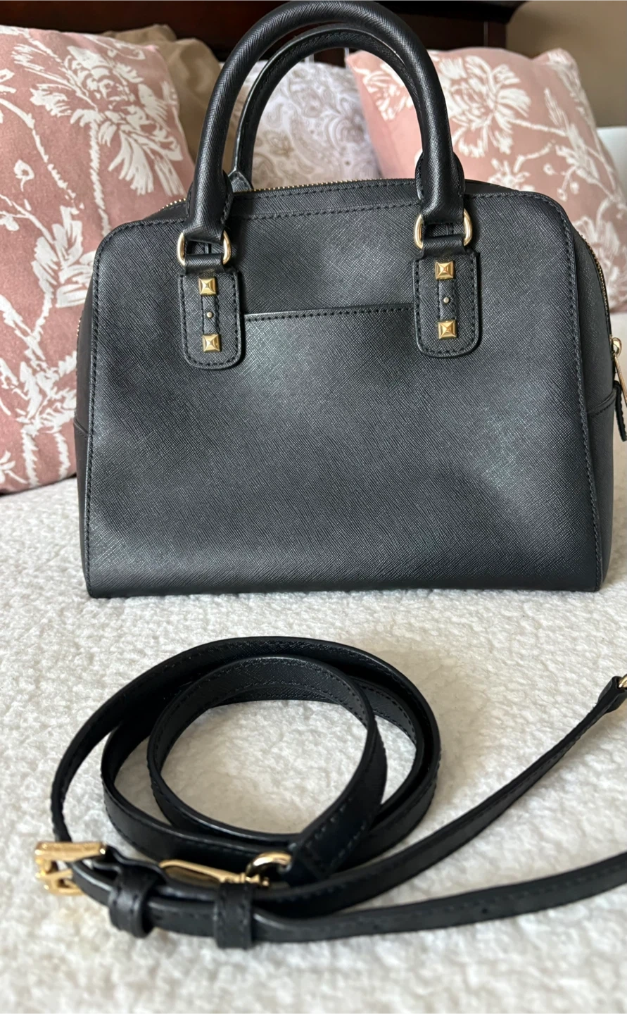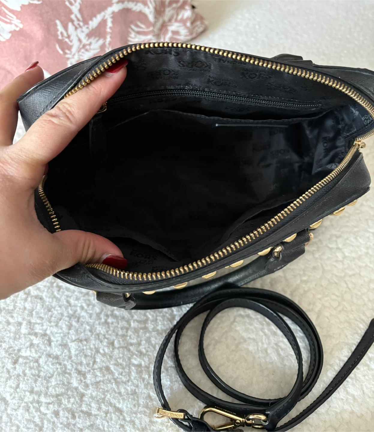 This is a Michael Kors satchel handbag in black. It features gold-tone stud detailing and comes with a detachable shoulder strap. Inside, it has a zippered pocket and slip pockets.