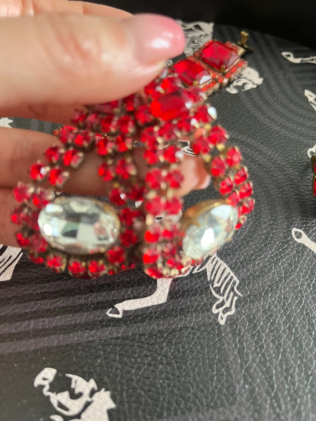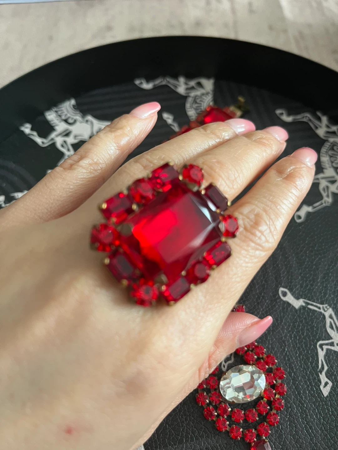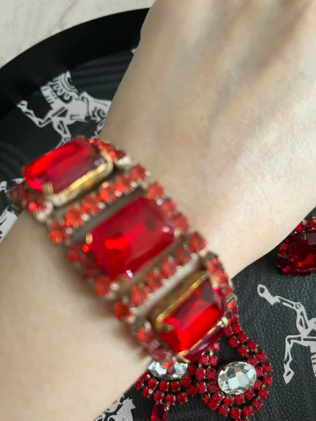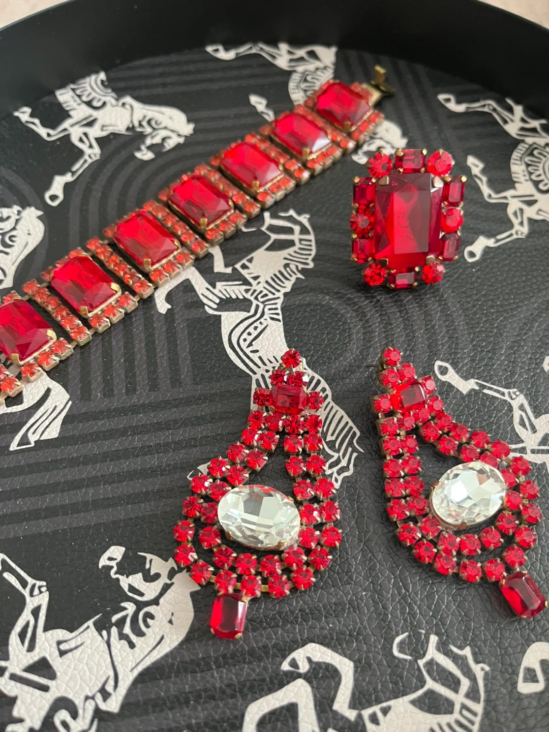 Vintage Red Rhinestone Bracelet, Ring, and Earrings Set