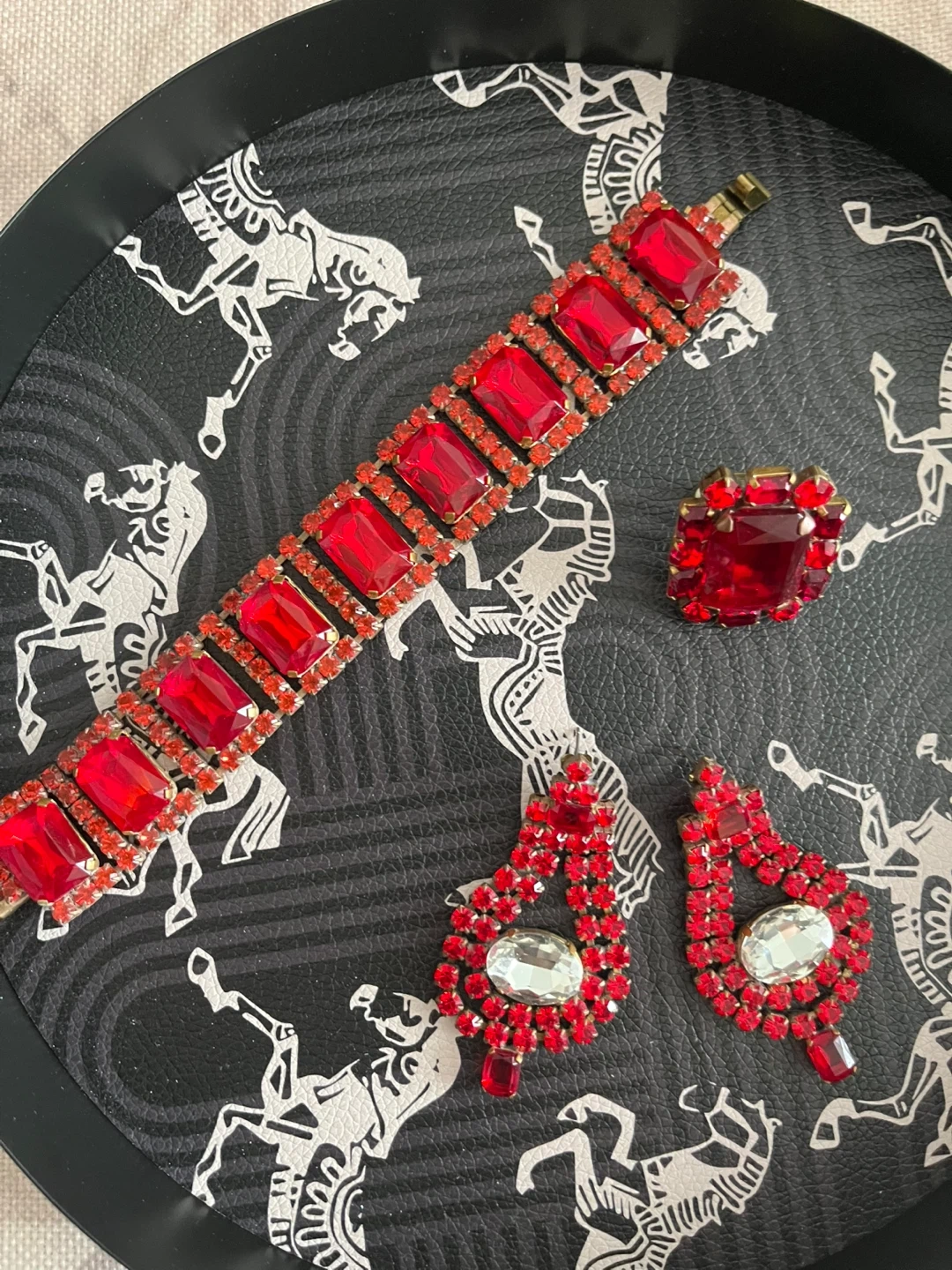 Vintage Red Rhinestone Bracelet, Ring, and Earrings Set