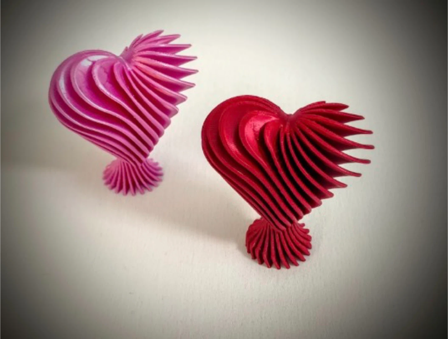 Decorative heart sculptures,. They're made with a layered, swirling design and stand on a ribbed base. These eye-catching pieces add a pop of colour to any shelf or tabletop!