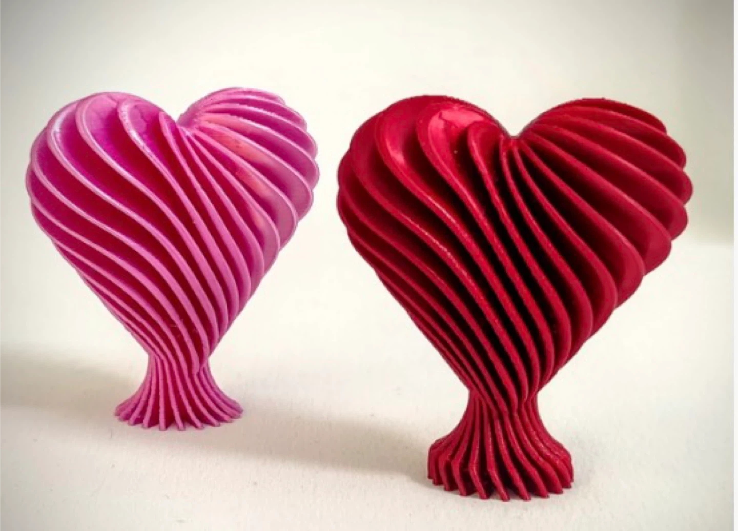Decorative heart sculptures,. They're made with a layered, swirling design and stand on a ribbed base. These eye-catching pieces add a pop of colour to any shelf or tabletop!